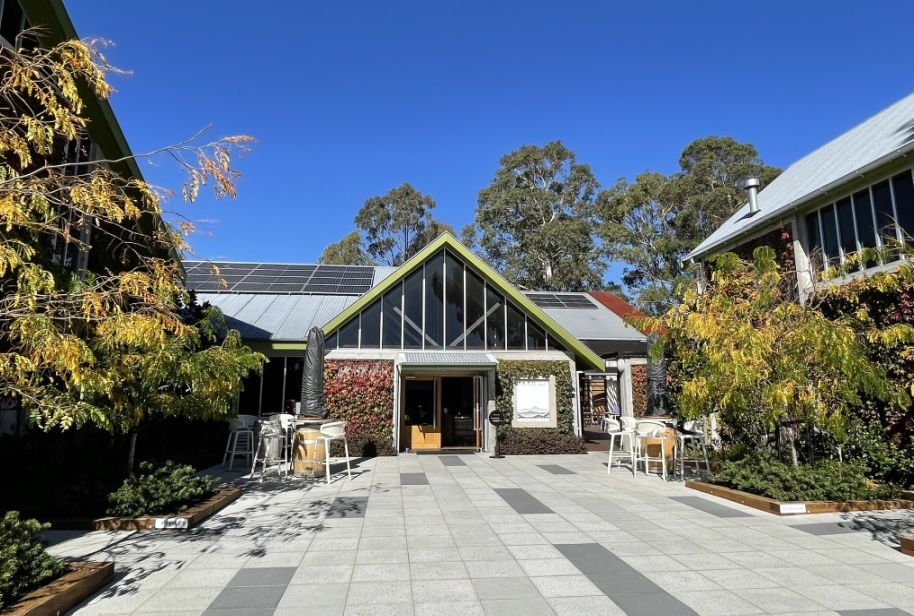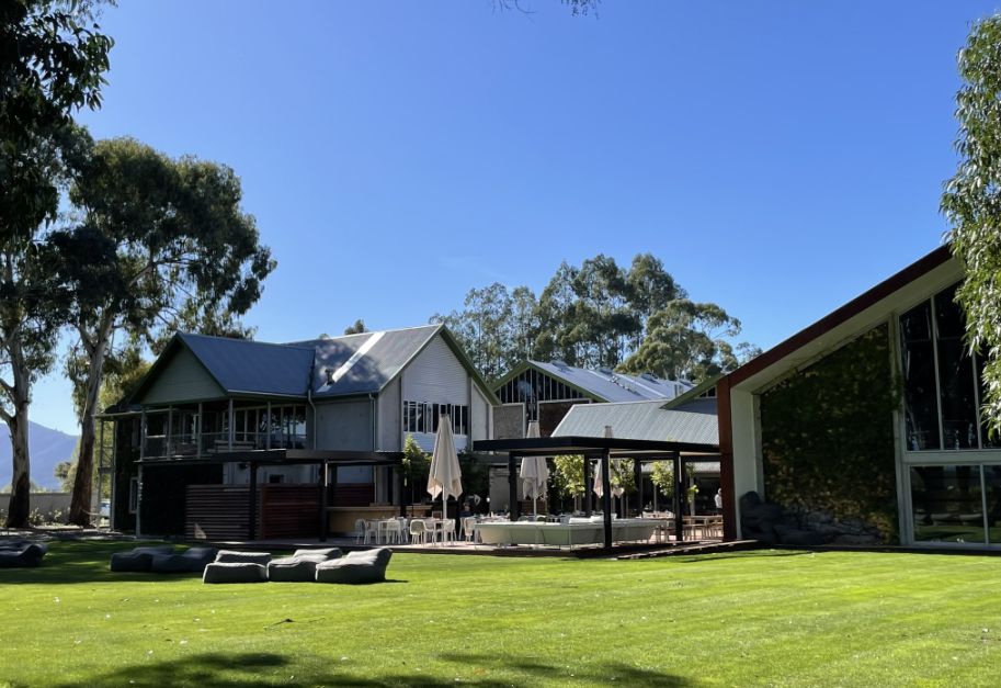 Tasting room is a low profile structure with clean lines, glass walls, and timber finishes. Its architectural style reflects a balance between luxury and nature, contemporary yet rooted in the land.