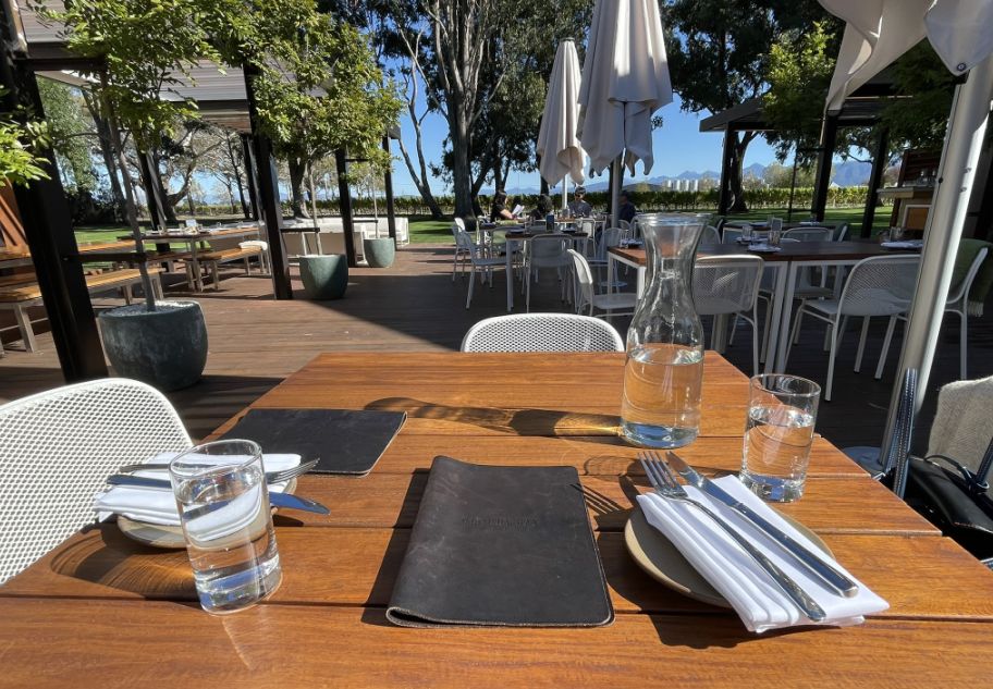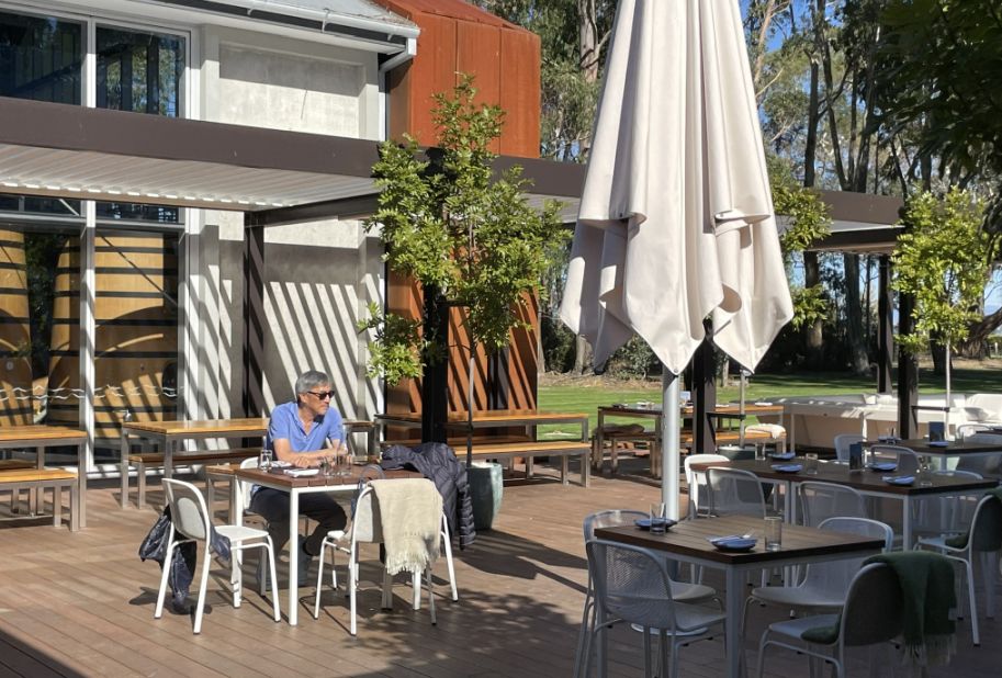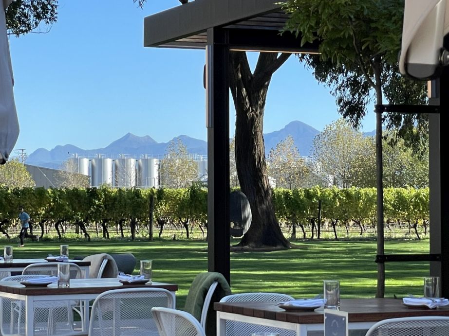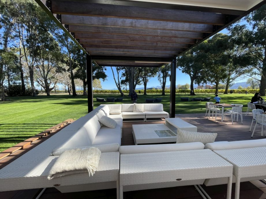 We are now in the Patio and deck area offering open-air seating with panoramic views of the vineyard and the mountains in the distance.