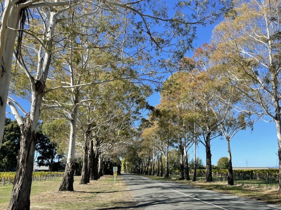 After the tree-lined stretch, the road opens up to reveal expansive vineyards on either side, rows upon rows of neatly pruned vines.