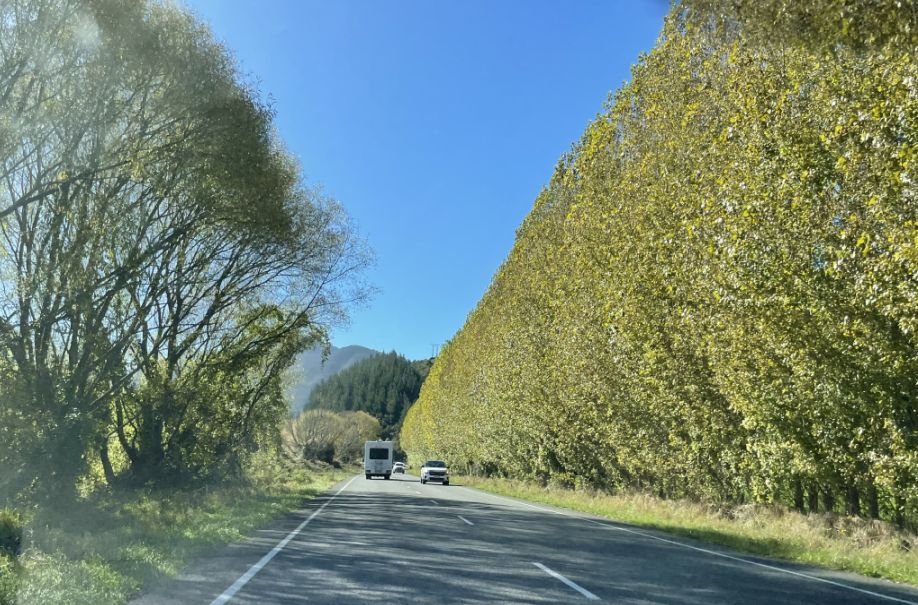 Along State Highway 6 near the Pelorus River, the row of tall trees you’re seeing is a striking and memorable feature of this scenic route. These trees are likely European poplars or redwoods, planted decades ago to line parts of the highway and shelter farmland from wind and erosion.