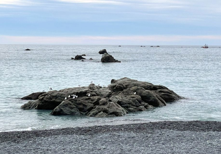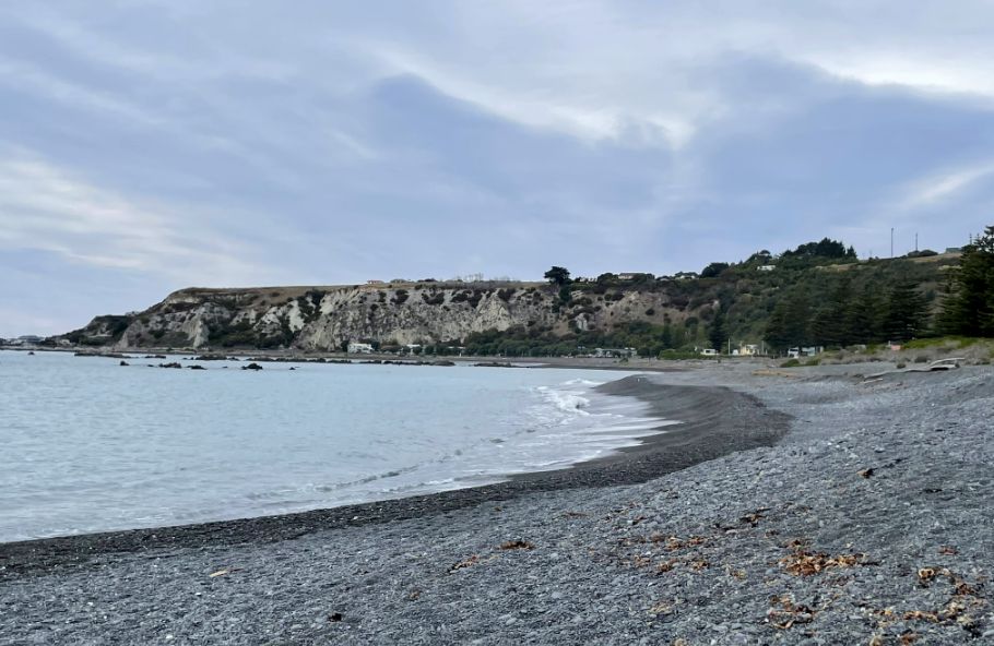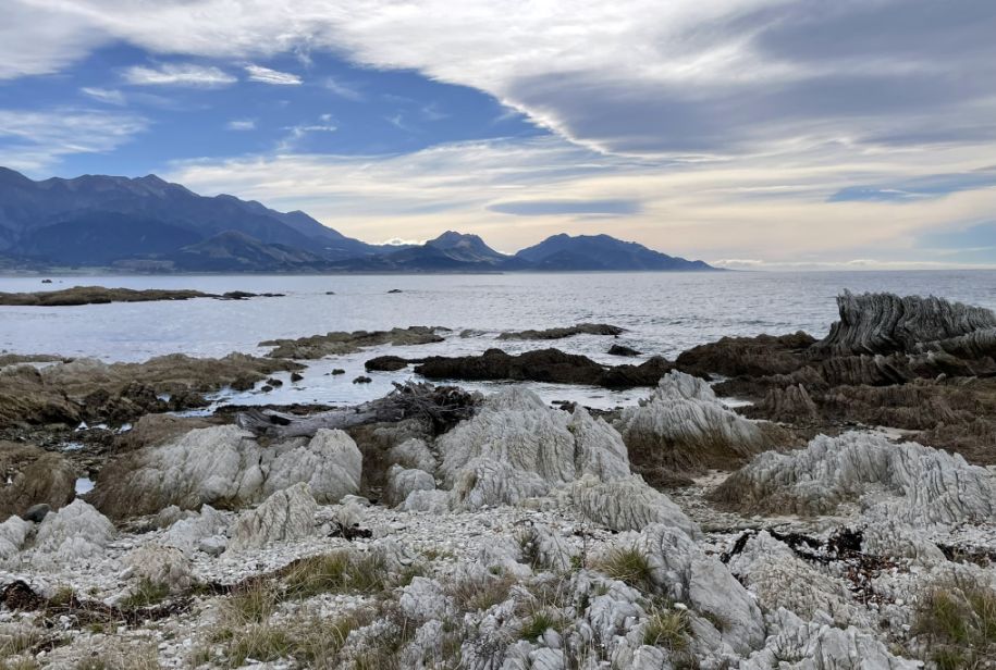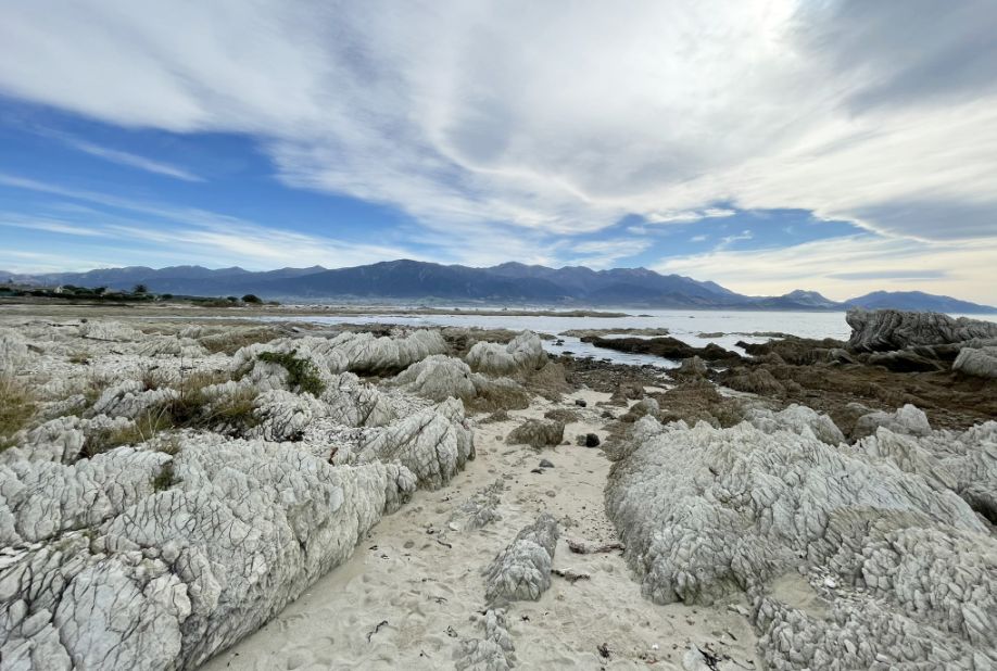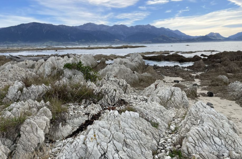 As you walk further toward the Kaikoura Peninsula, the beach becomes noticeably rockier, with large, uneven white limestone and weathered rocks replacing the darker sand and pebbles.