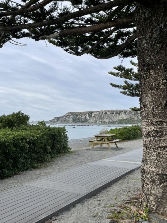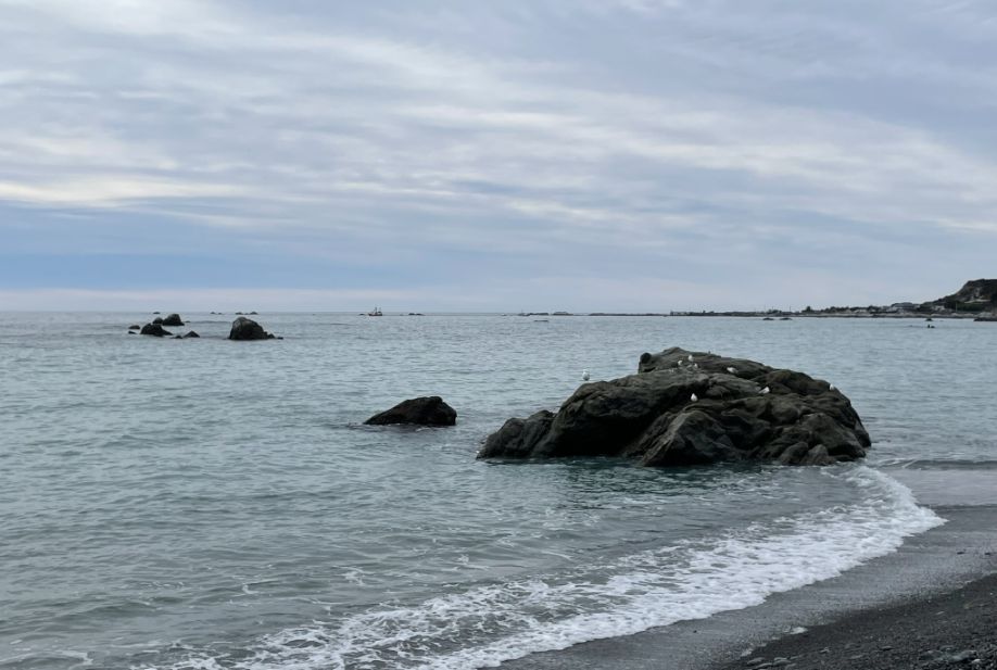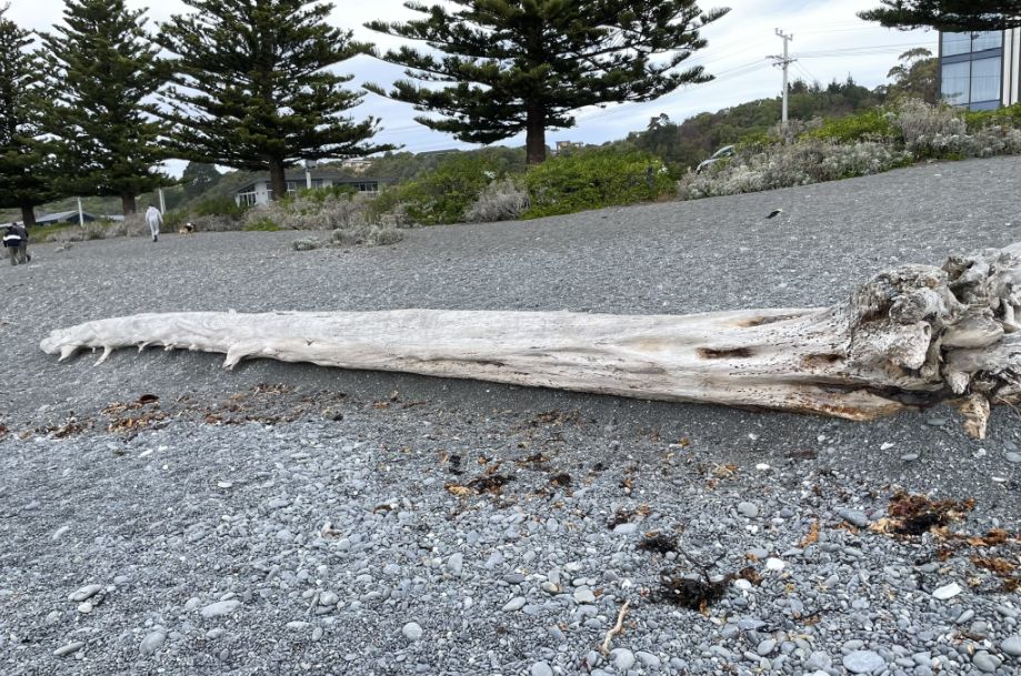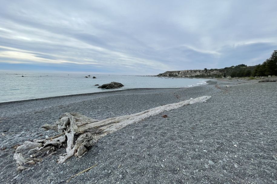 Along the shore of Kaikoura Beach, you’ll often find large pieces of driftwood scattered among the pebbles and coarse sand. The one you're seeing might have been washed in from nearby rivers or tossed ashore during storms.