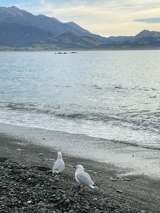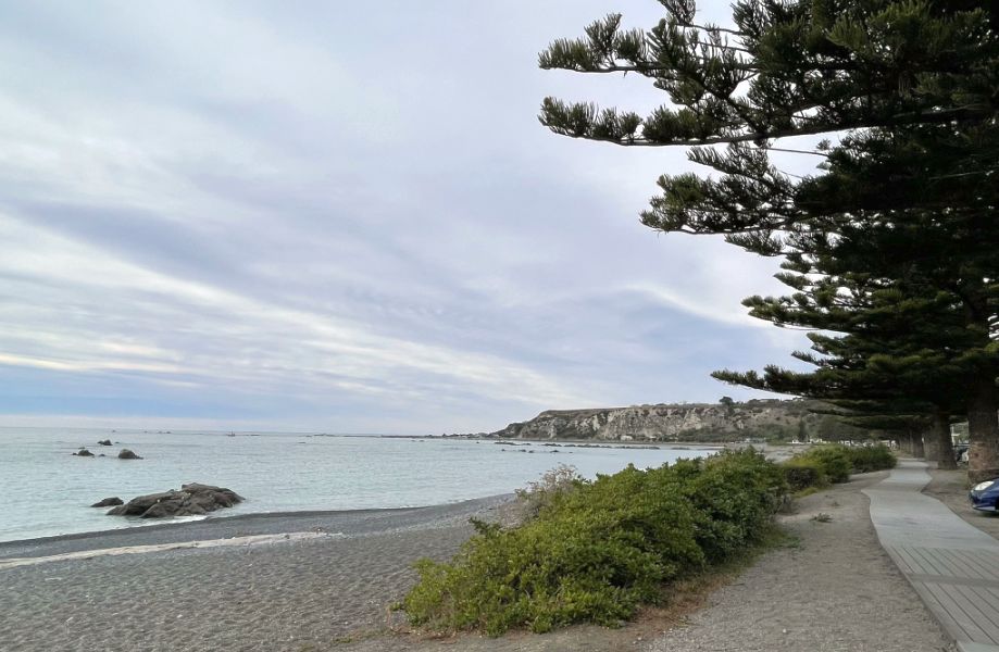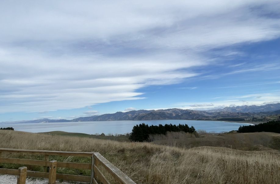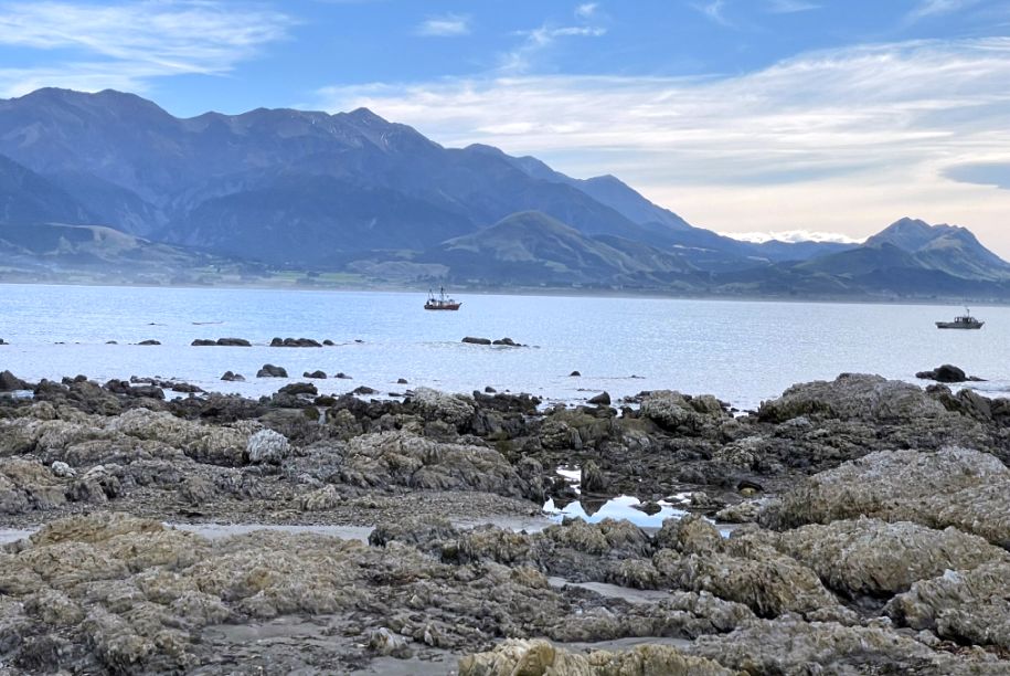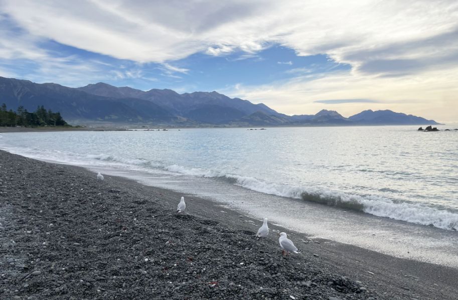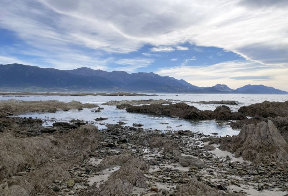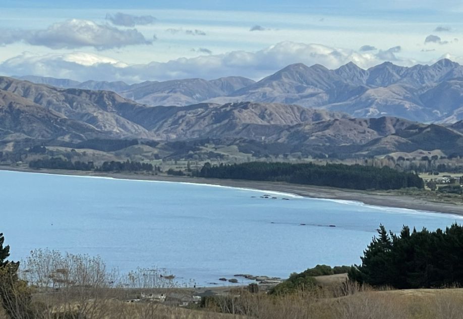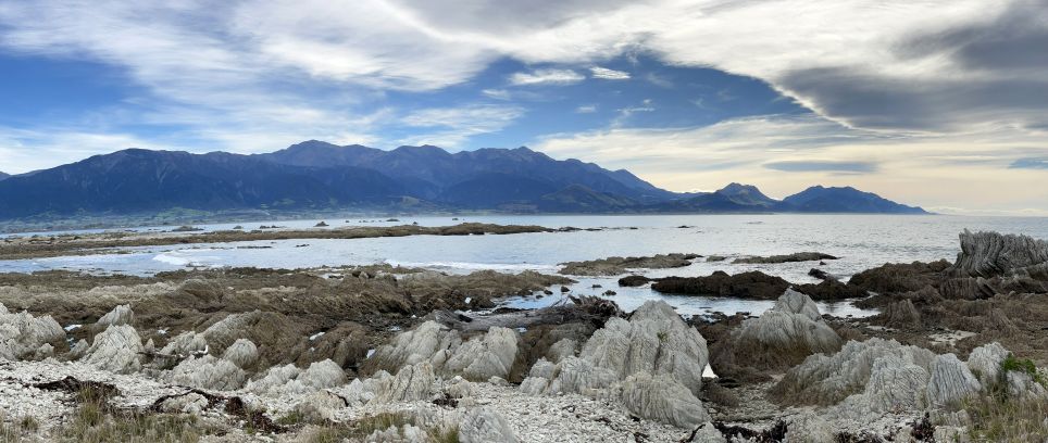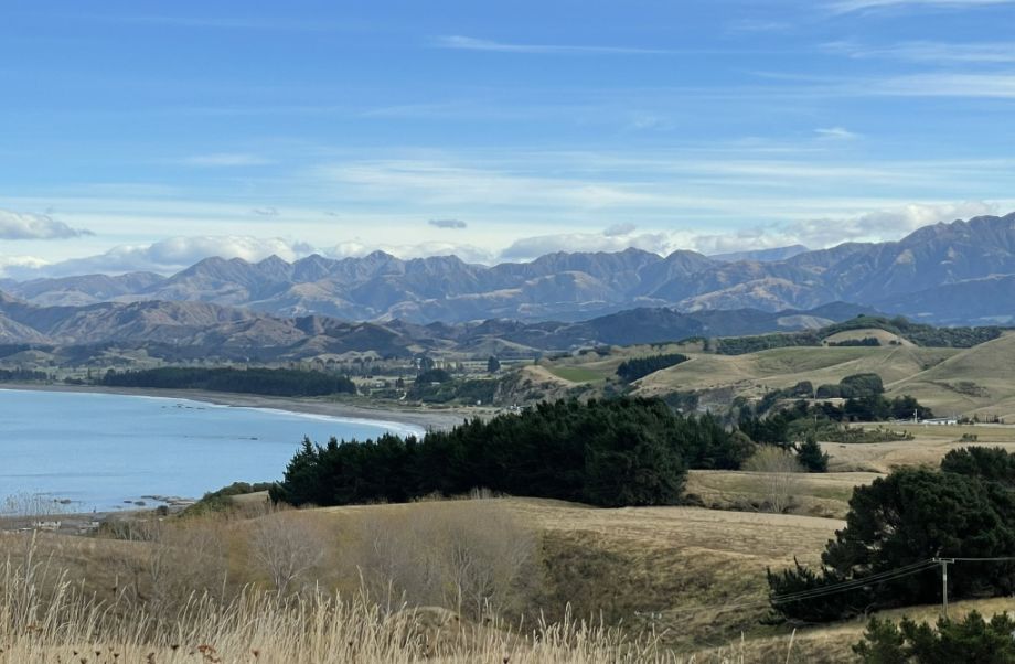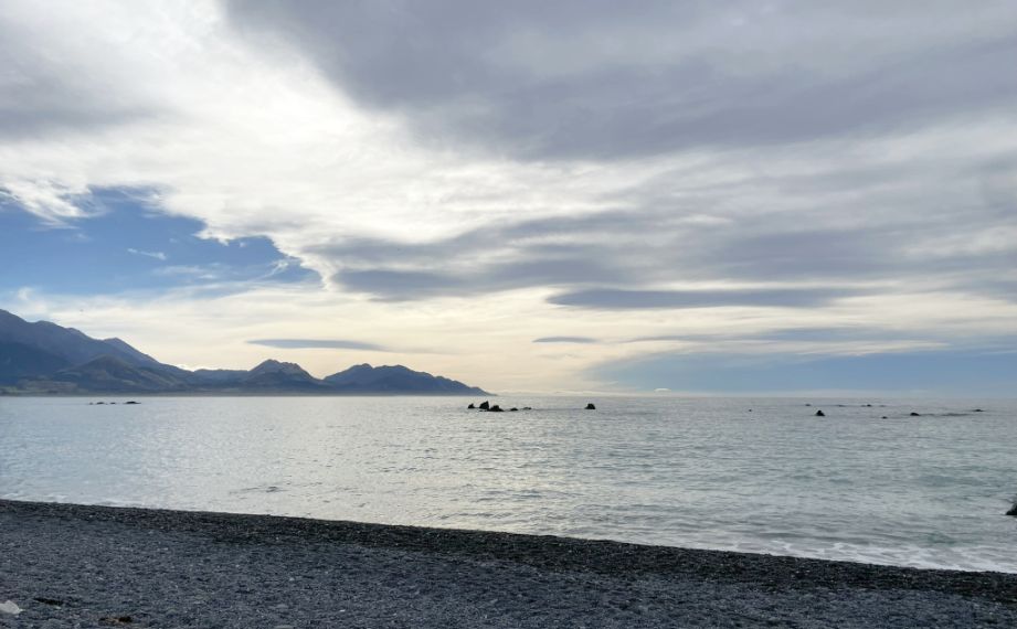 When facing the Ocean and to the left, the Kaikoura Ranges stretch along the horizon, rugged, towering mountains that often still hold snow on their peaks, even in warmer months. Their presence so close to the sea is striking and rare.