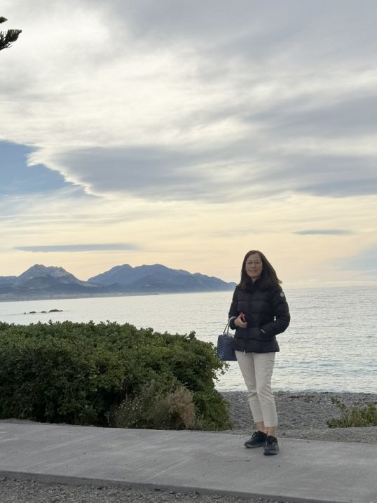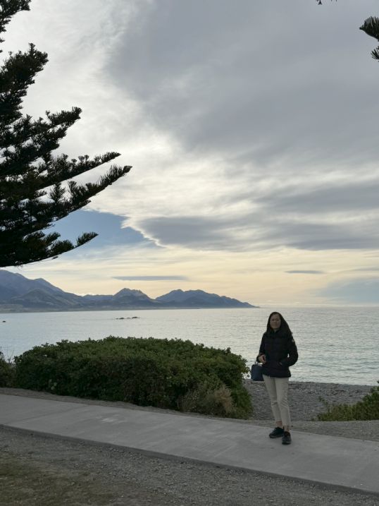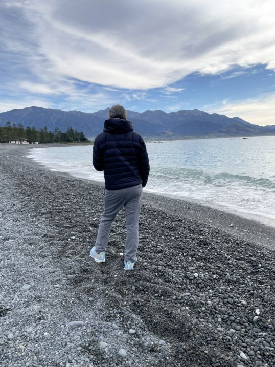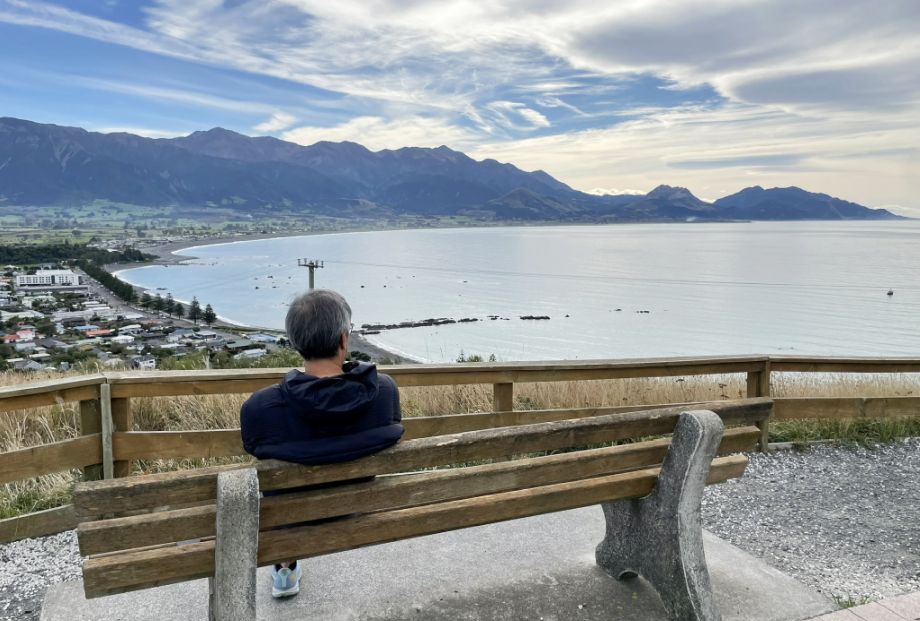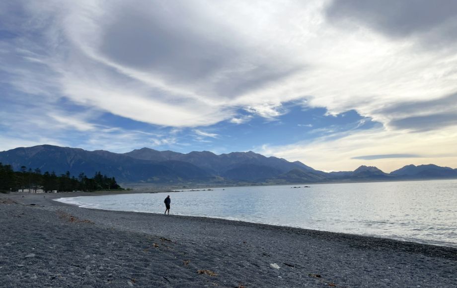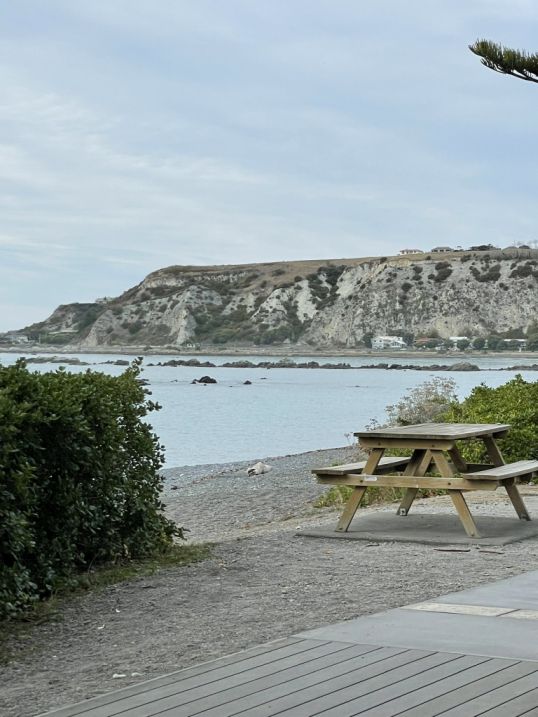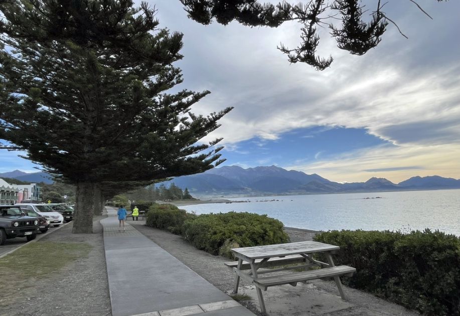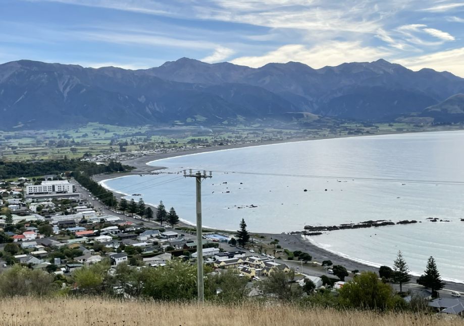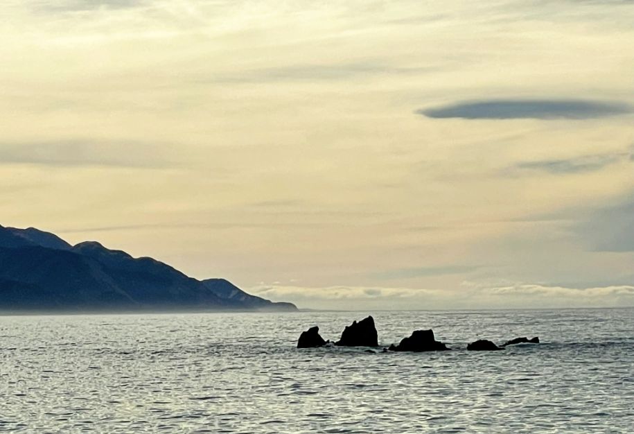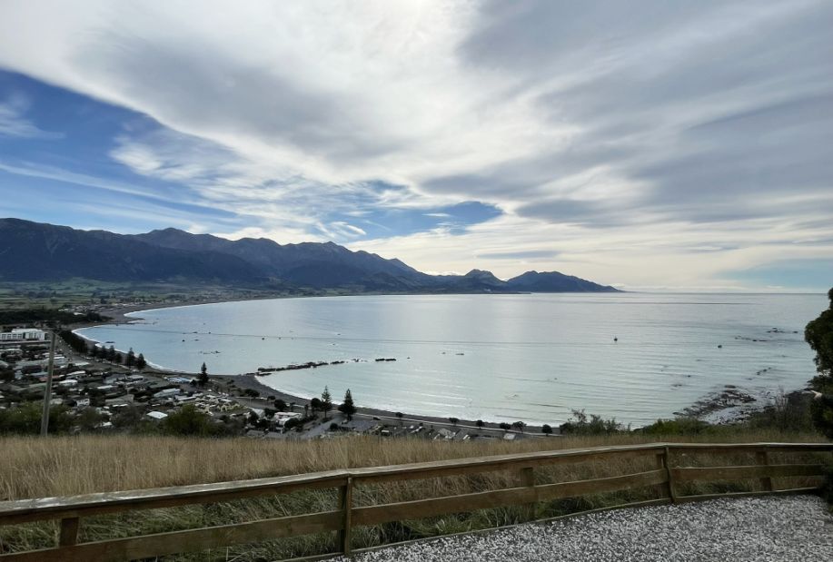 When facing the Ocean and to the left, the Kaikoura Ranges stretch along the horizon, rugged, towering mountains that often still hold snow on their peaks, even in warmer months. Their presence so close to the sea is striking and rare.