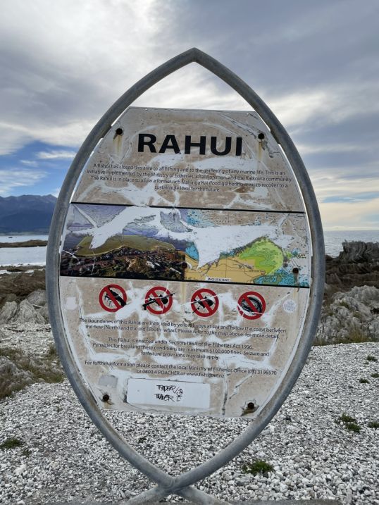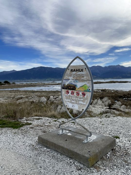 "Rāhui” sign is a traditional Māori practice that places a temporary restriction on an area. A rāhui is often used to protect natural resources, allow an ecosystem to recover, or mark respect after significant events. In Kaikoura, rāhui are sometimes placed after earthquakes or to help marine life regenerate, especially after environmental pressures. It’s a reminder of the deep cultural connection Māori have with the land and sea, and of the ongoing effort to protect this unique coastal environment.