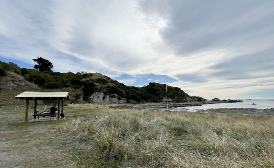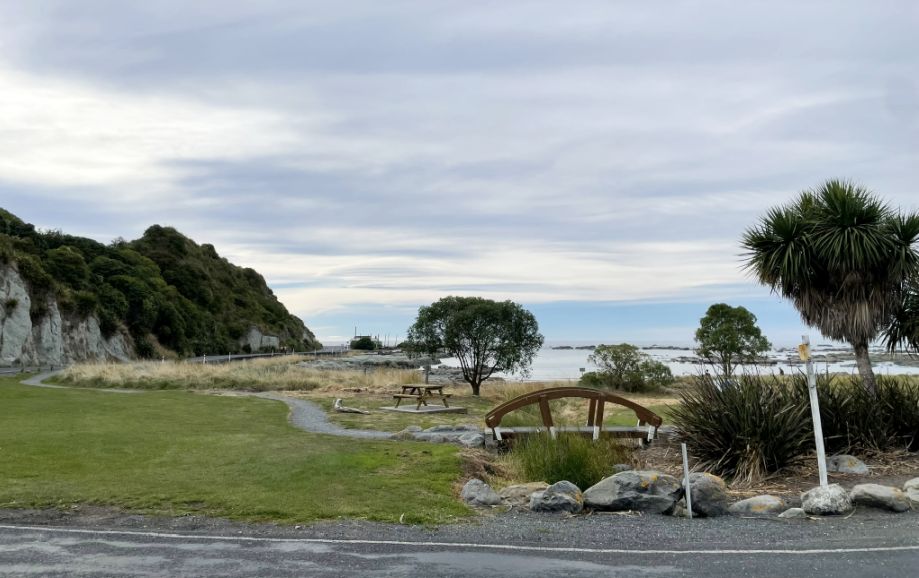 Set against the backdrop of the rocky shoreline and expansive ocean, the area is simple but inviting, a grassy area with wooden picnic tables, often used by walkers, families, or travelers stopping for a break.