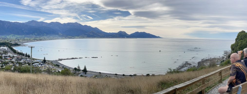 Once you're up on the cliff along the Kaikoura Peninsula, the view opens up dramatically. Below, you can see the curved beach stretching out along the coastline.