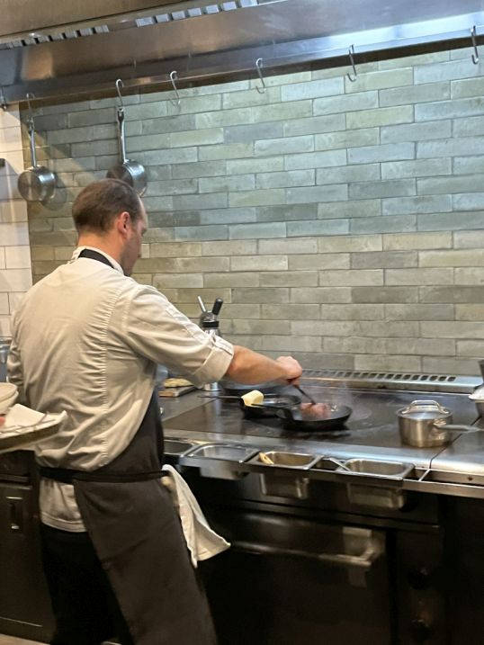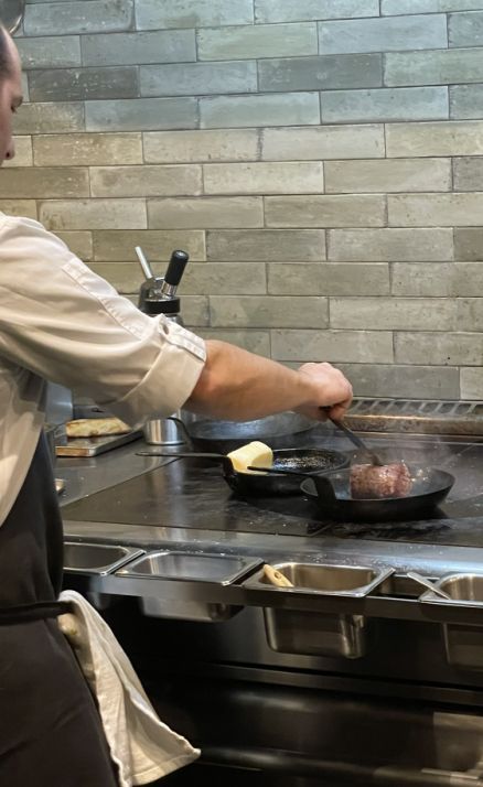 While waiting for our next dish, chef Chris is putting a piece of meat on a very hot skillet.