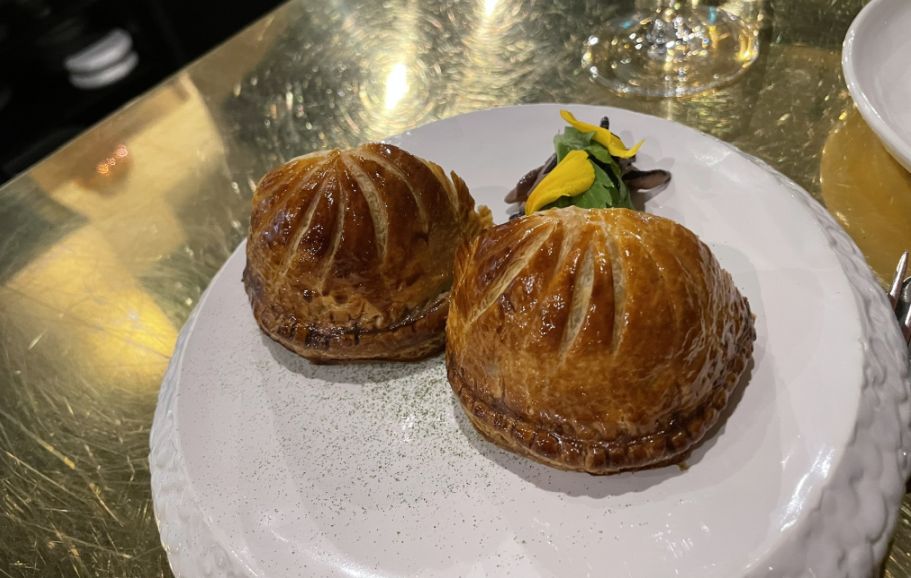 The meat pie is cut in half and is served with sautéed mushrooms.