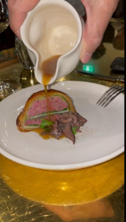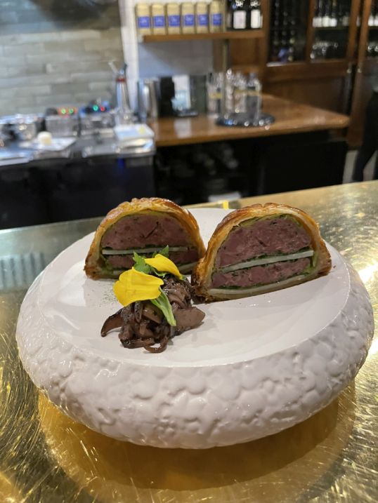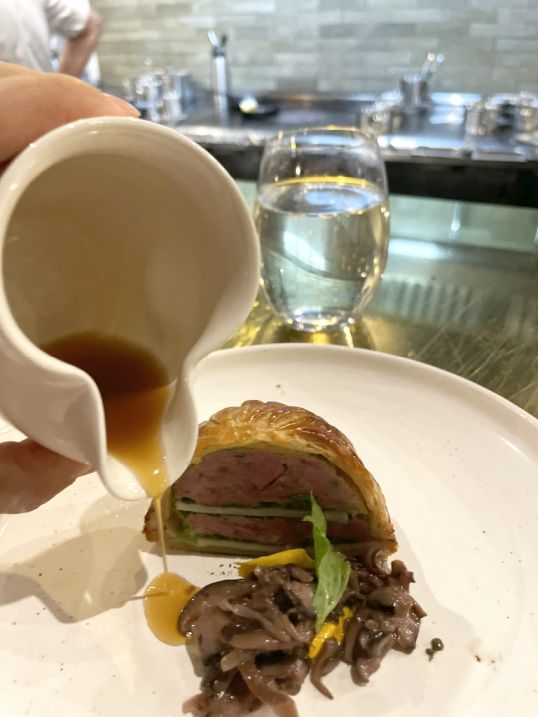 One of the chef working on our next dish. Here he is wrapping the meat with puff pastry.