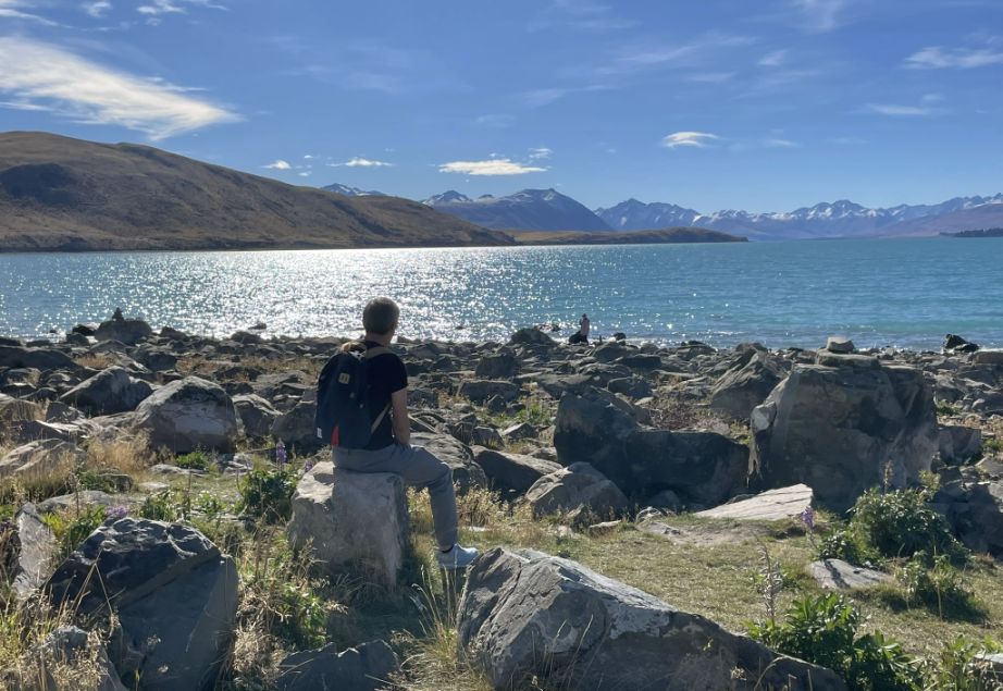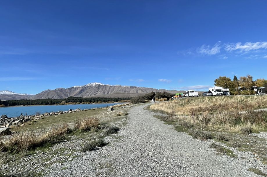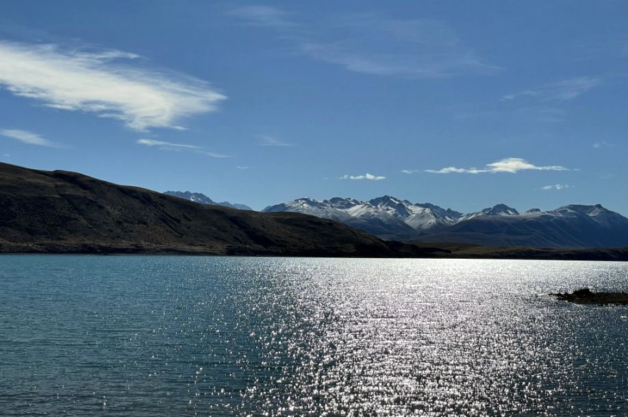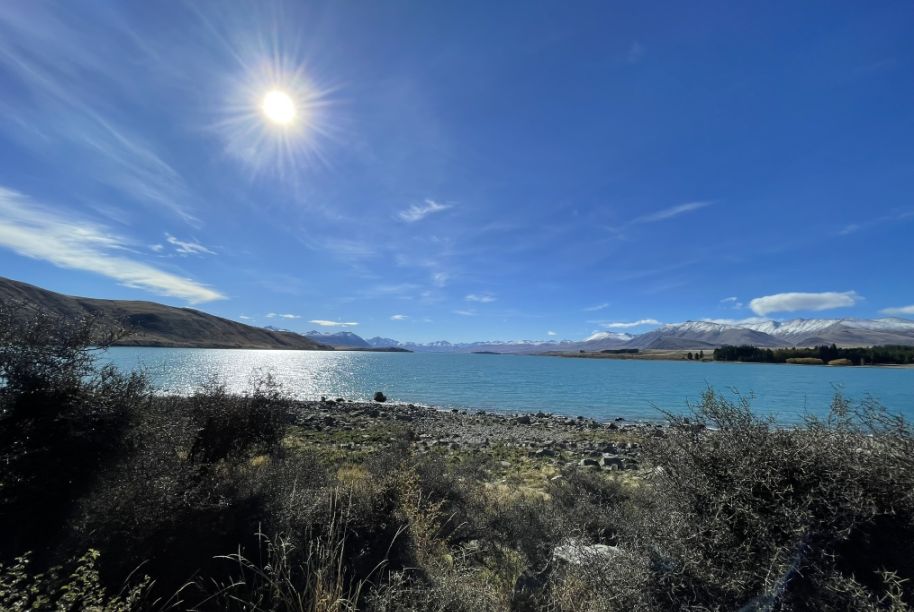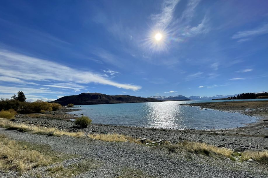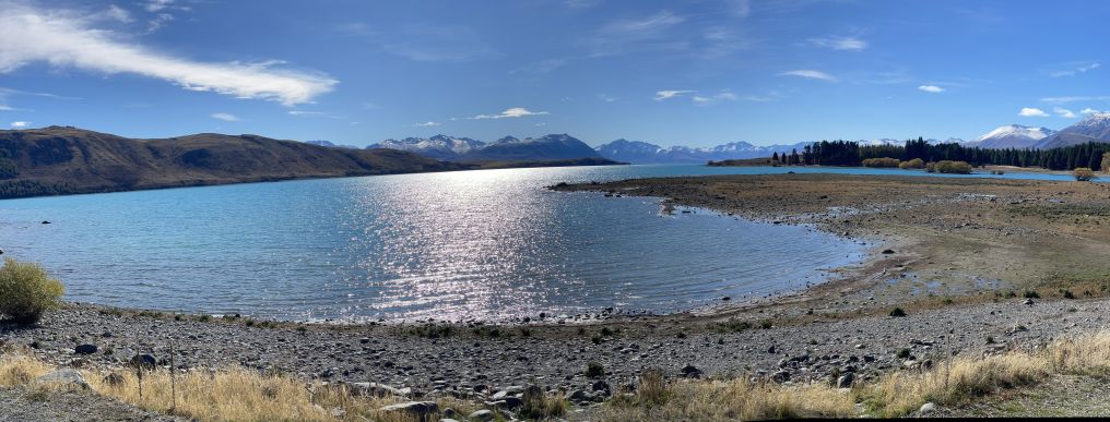It is so beautiful here with the view of the lake overlooking the Two Thumb Range, which stretches to the right), the mountains on the left-hand side is the Mount John Range and, further west, parts of the Ben Ohau Range.