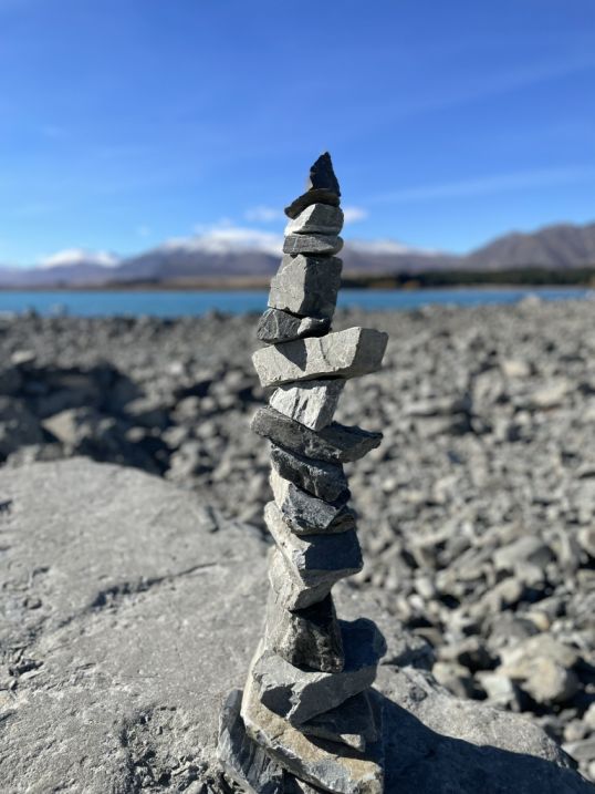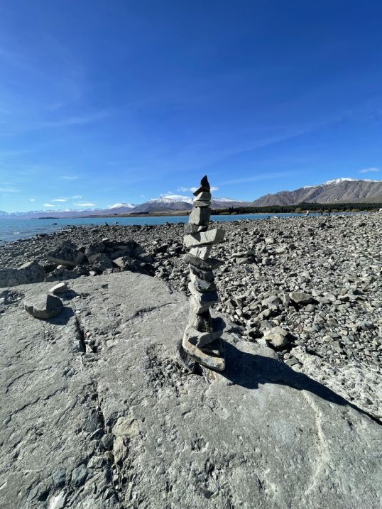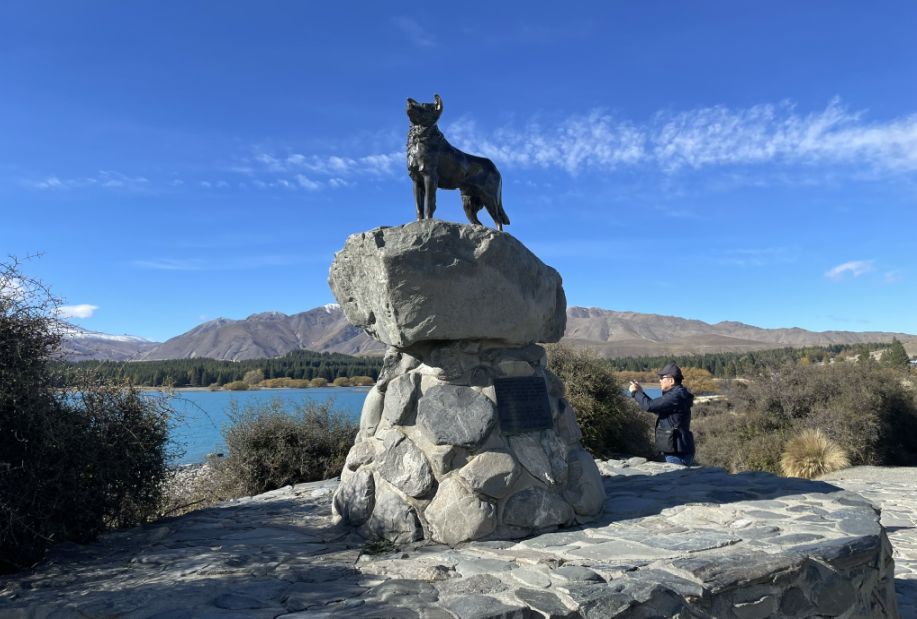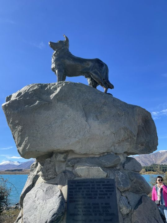 This is the most iconic spot on the lake with the statue of the Collie Dog, overlooking Lake Tekapo, standing proudly on a mound of natural stone with the Two Thumb Range and snow-capped mountains behind it.