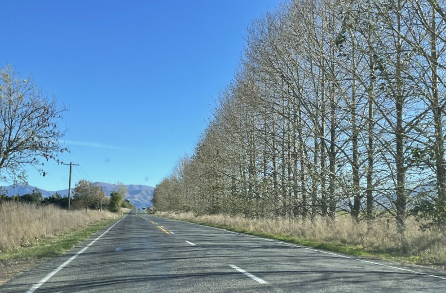 The row of trees lining the road is a common and scenic feature on State Highway 79 and in the fall the leaves turn golden, adding the warmth and contrast to the landscape.