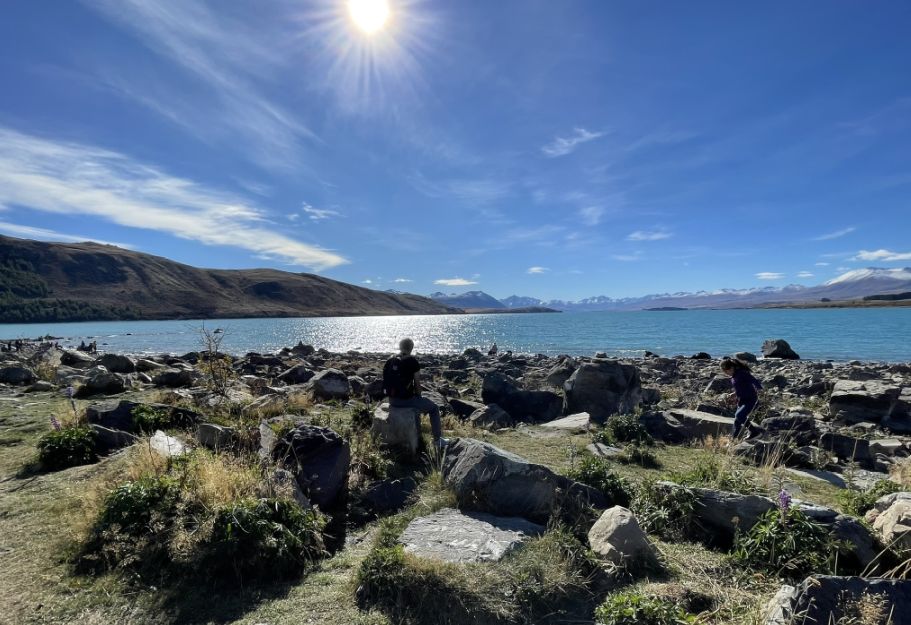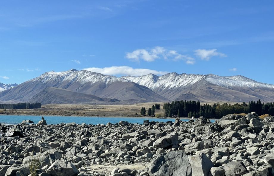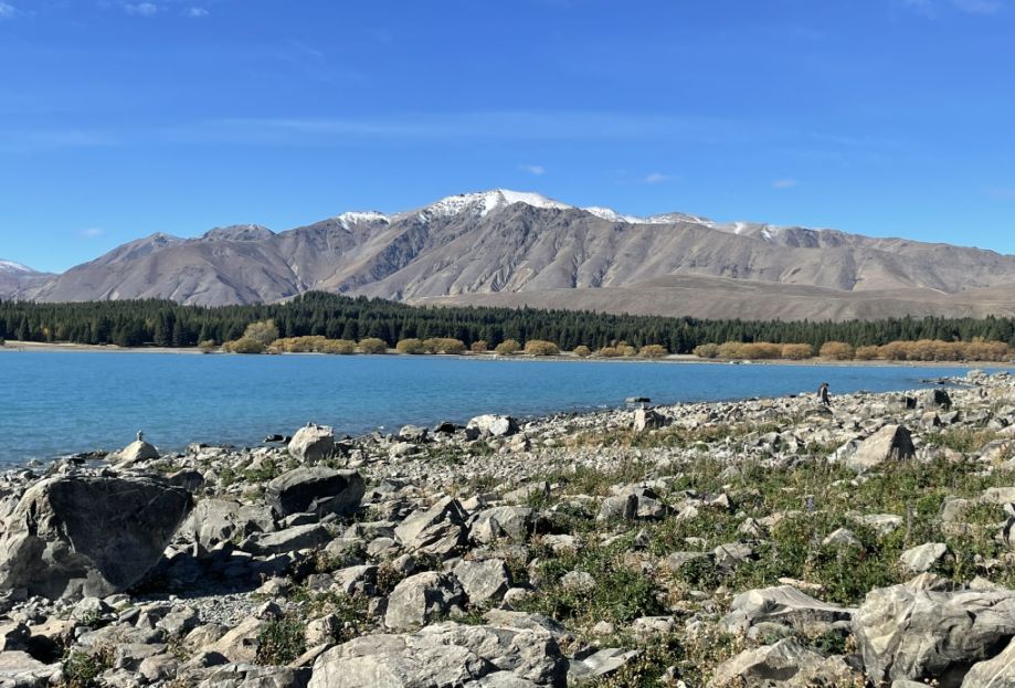 The rocky shore of Lake Tekapo is framed by the Two Thumb Range and nearby forested slopes, especially beautiful in the crisp clarity of the Fall.