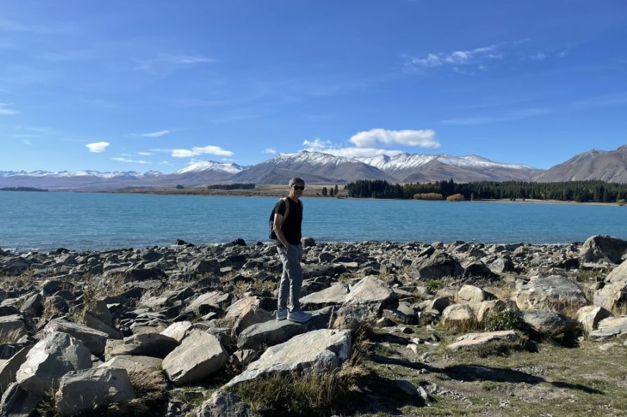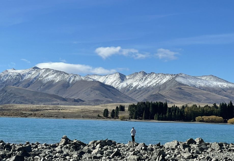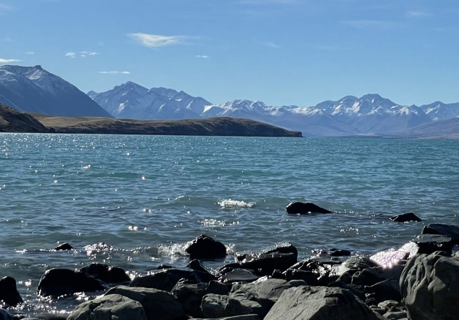 Across the rocky shore of Lake Tekapo with glacial-blue water, we can see a band of dark green forest runs along the base of the mountains, a soft contrast to the sharp white peaks above. The Two Thumb Range rises in the distance, its snow-covered summits glowing in the late afternoon light.