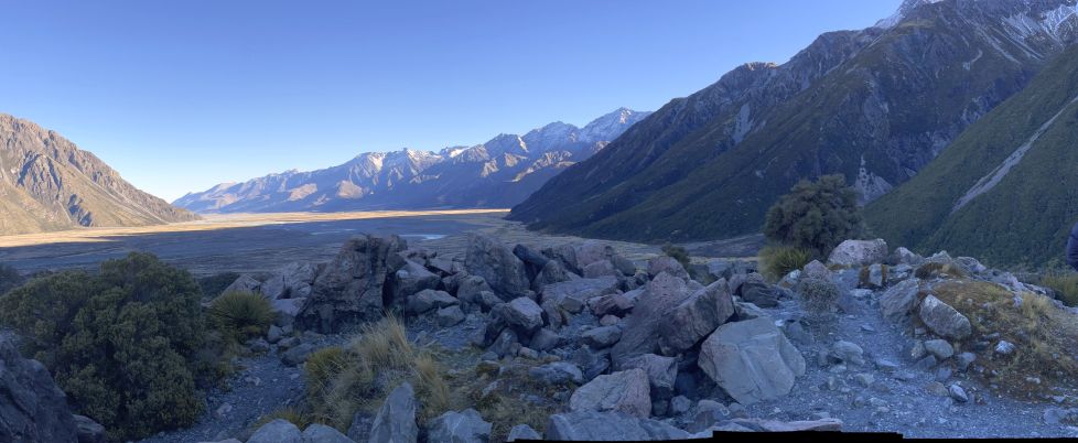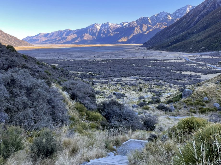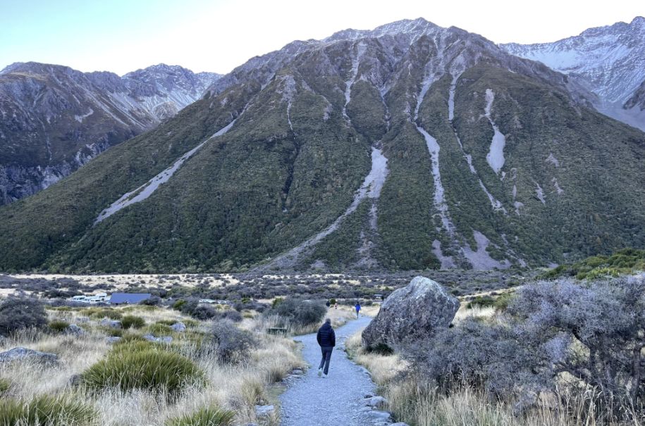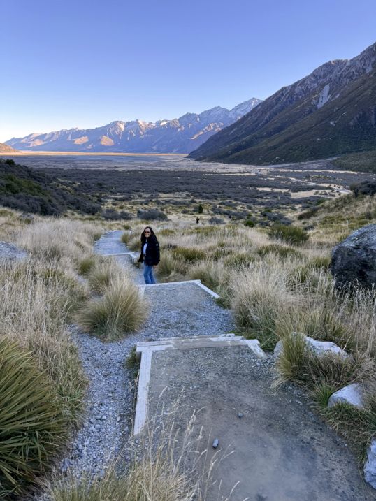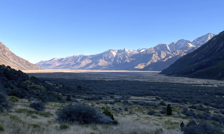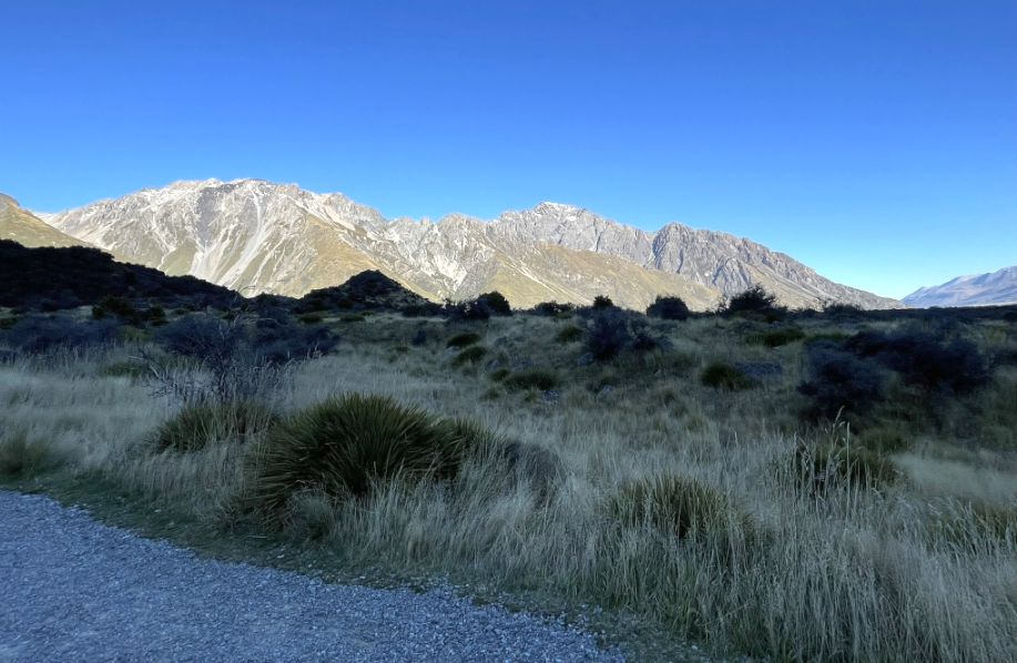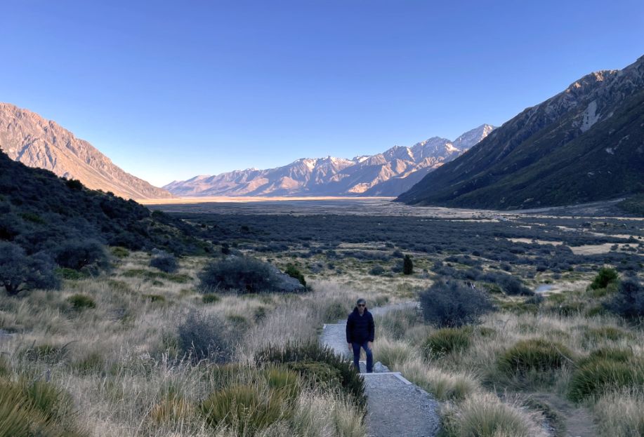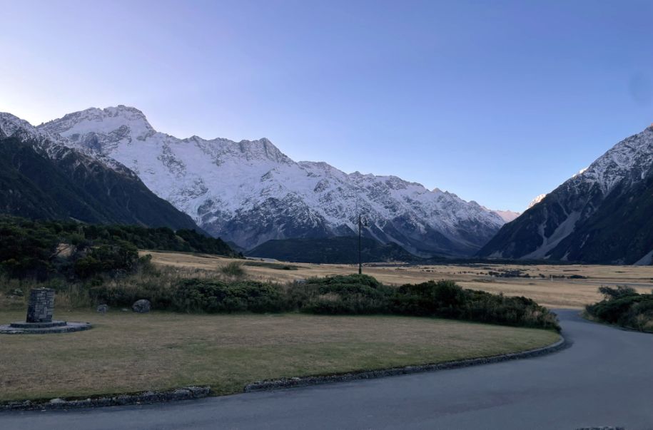 Just before reaching the parking lot, we paused again, this time to take in the vast valley that stretched endlessly before us. A towering mountain stood at the far end, dominating the landscape with its sheer size and presence.. It was a grand and peaceful farewell to an unforgettable walk through one of the most majestic corners of Aoraki/Mount Cook National Park.