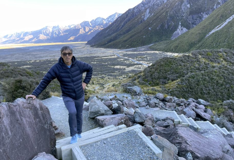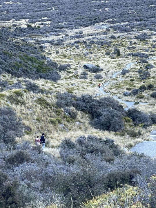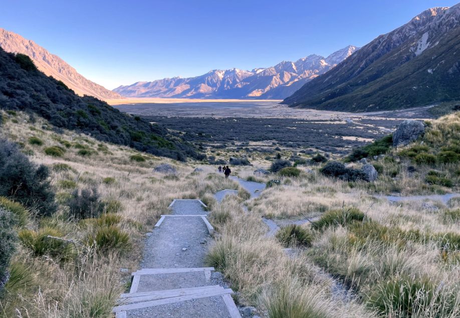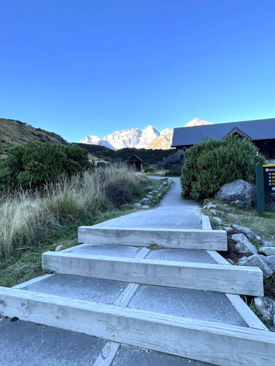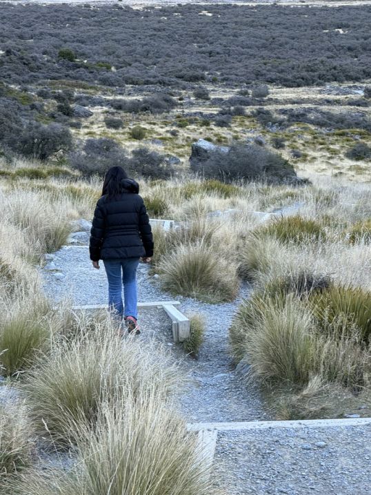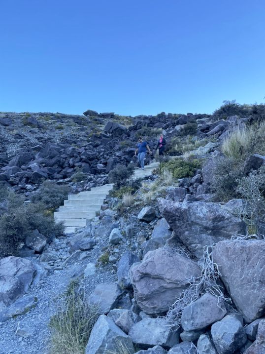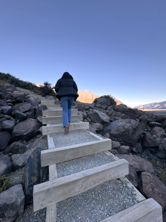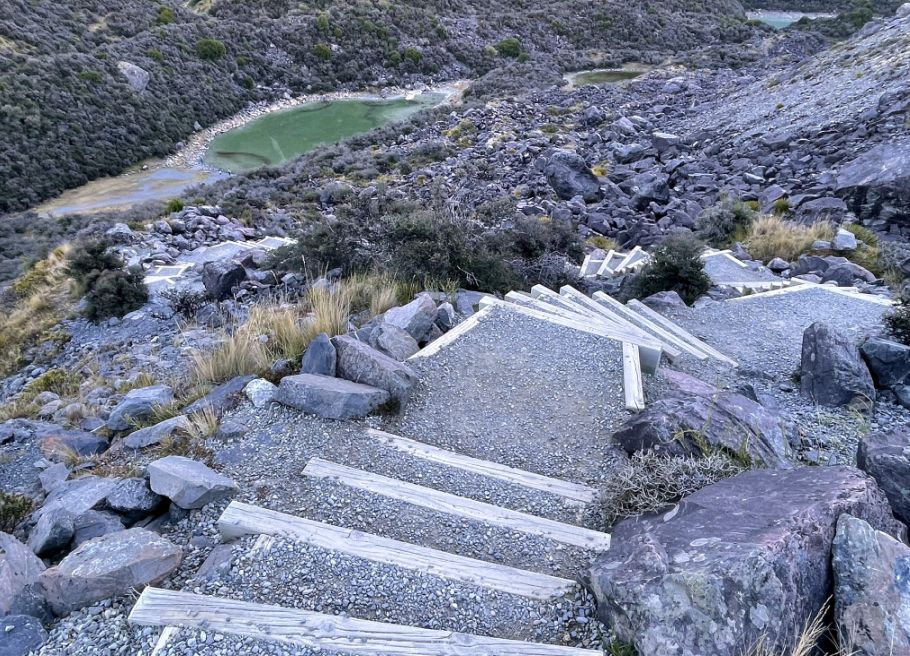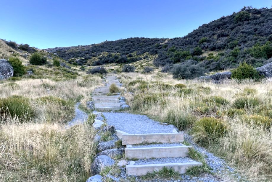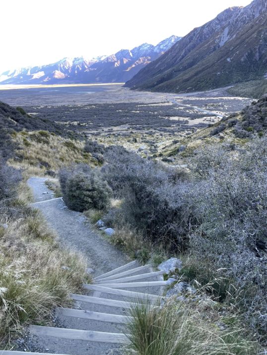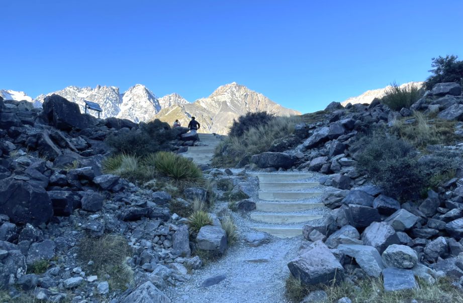 As we continued up the trail, the steps gradually became steeper, and we could feel the effort with each climb. The rocky stairs zigzagged up the hillside, but the views made every step worth it. The higher we climbed, the more the landscape opened up, revealing the raw, stunning beauty of the Tasman Glacier region.
