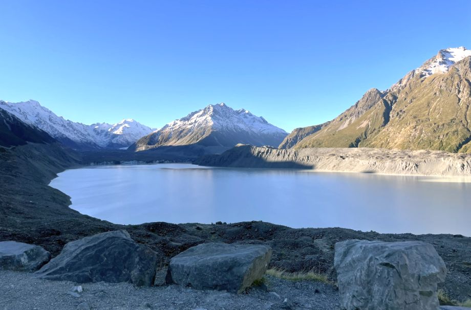 To its side, Mount Tasman and other rugged giants formed a powerful wall of rock. The lake is calm, and the silence around us deepened the sense of awe.