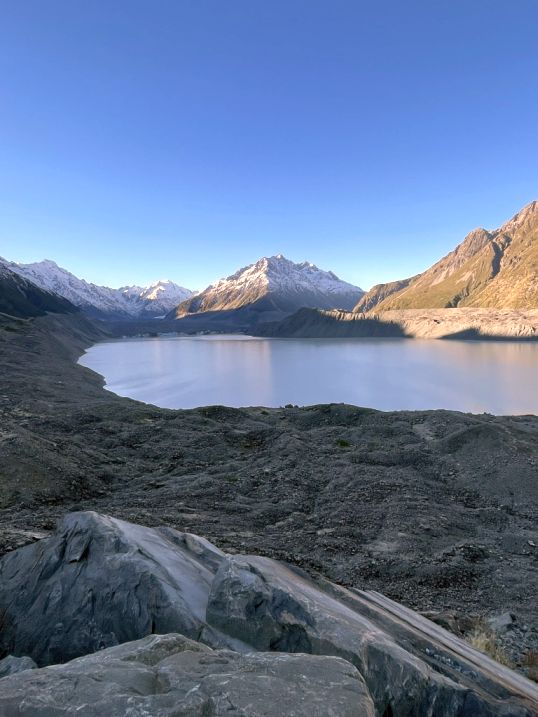 In front of us lay a massive, milky-blue lake which is the Tasman Lake, fed by the glacier just beyond. Surrounded by towering peaks and rugged terrain, the lake felt otherworldly, carved by time and ice. Standing there, taking it all in, the effort of the climb faded away, replaced by awe at the raw beauty stretched out before us.