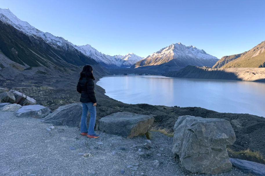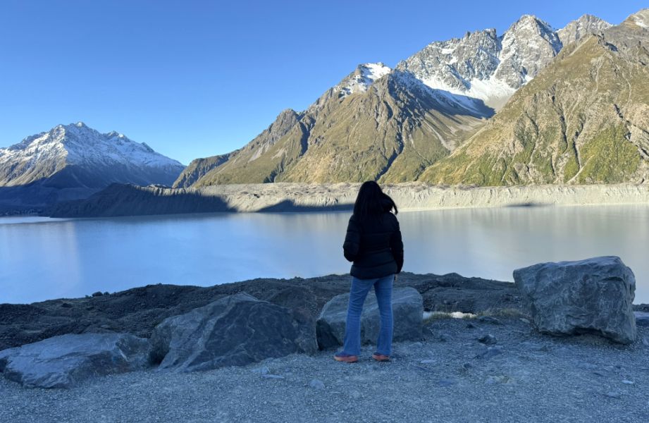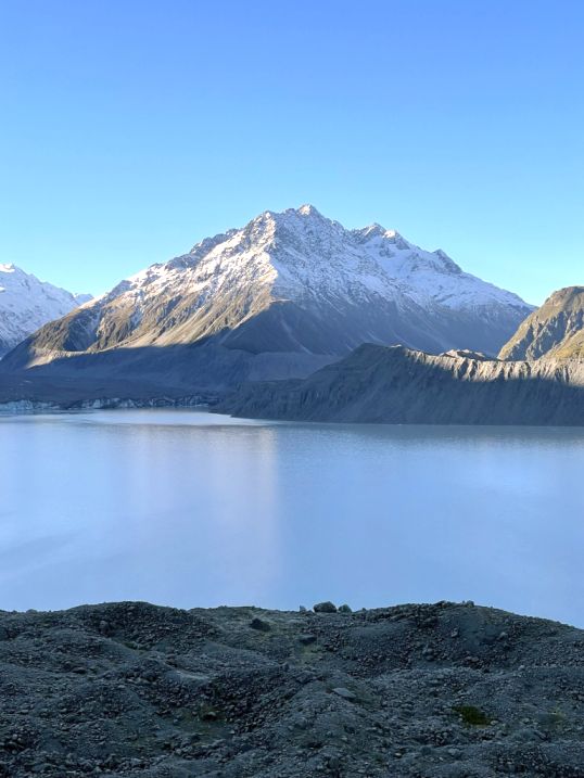 Standing at the edge of Tasman Lake, we faced a breathtaking chain of mountains stretching across the horizon. These were the Southern Alps/Kā Tiritiri o te Moana, their snow-capped peaks rising sharply into the sky. At the center stood Aoraki/Mount Cook, majestic and commanding, the tallest mountain in New Zealand.
