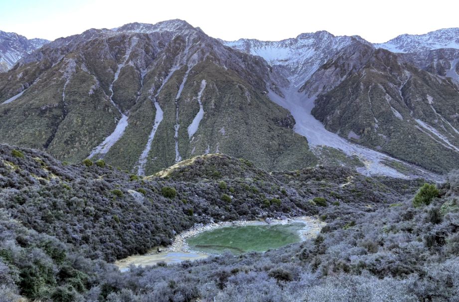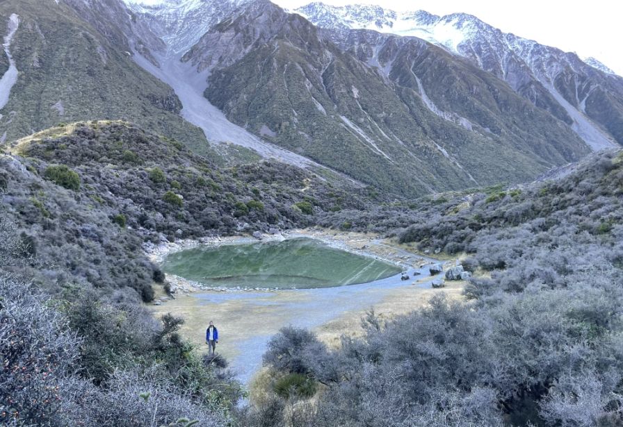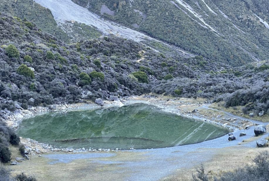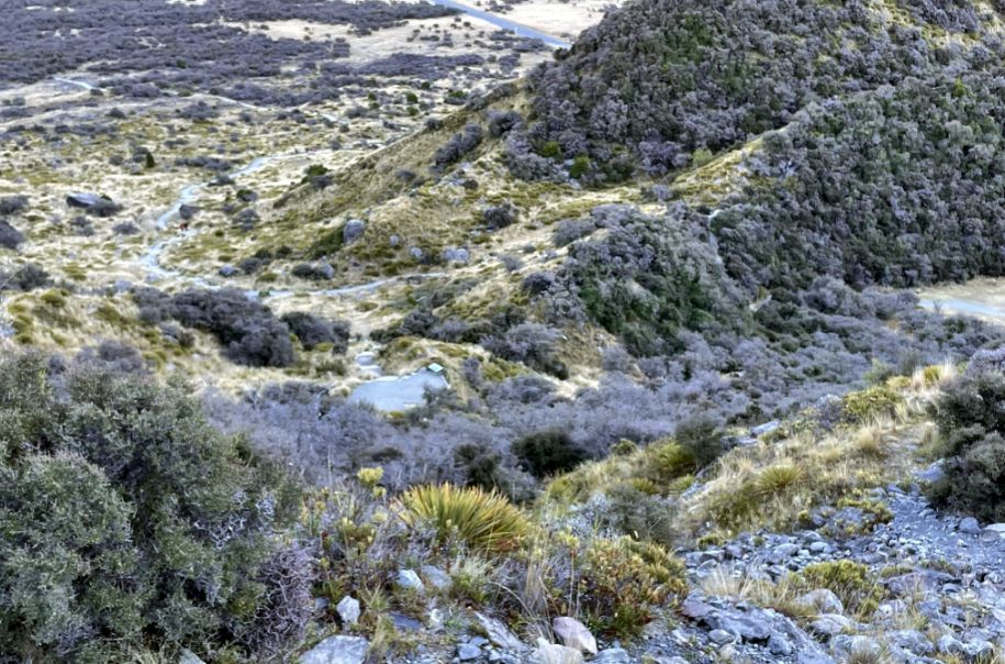 From the top of the hill we can see another water pool (in the center), it is one of the 3 Blue Lakes in the park. They are small glacial lakes located close to each other near the start of the Tasman Glacier Valley trail.