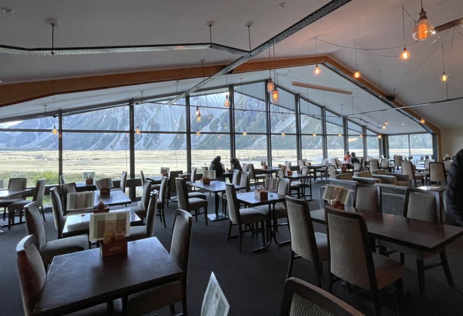 The interior of the Chamois Bar and grill with panoramic view of the Aoraki/Mount Cook. The restaurant offers casual dining and a cozy, laid-back vibe.