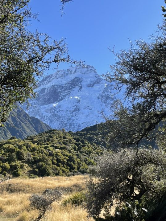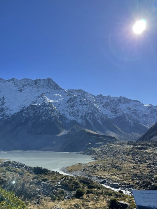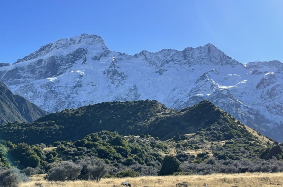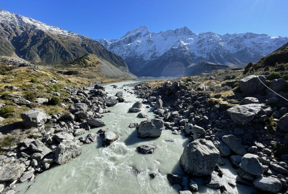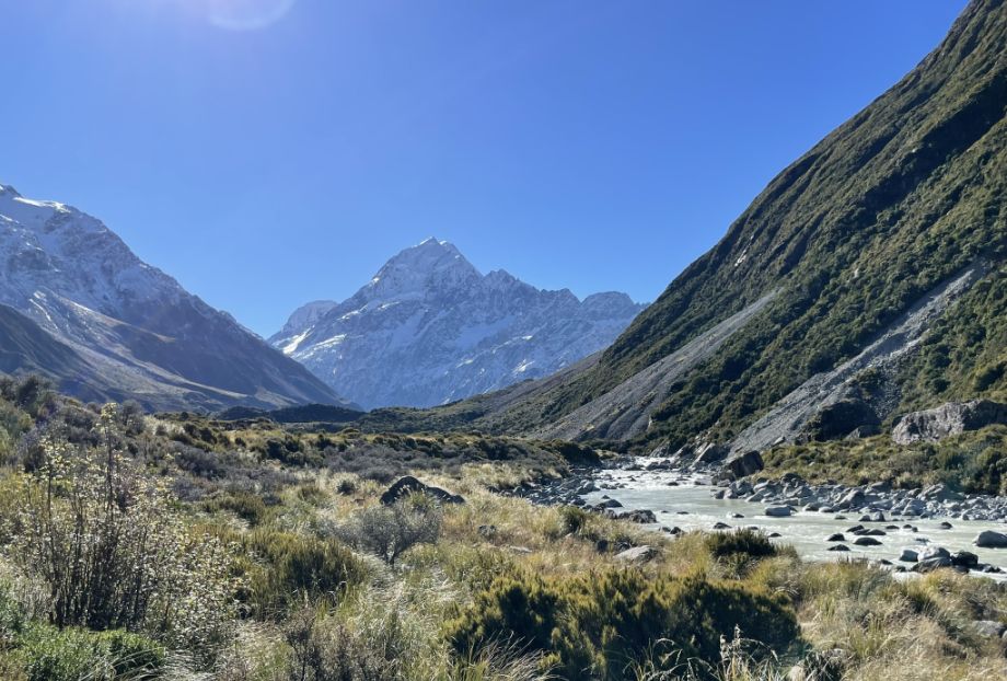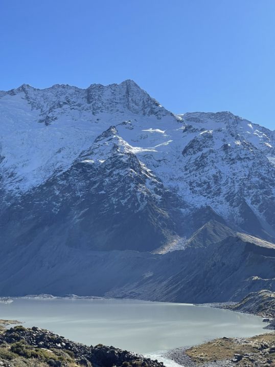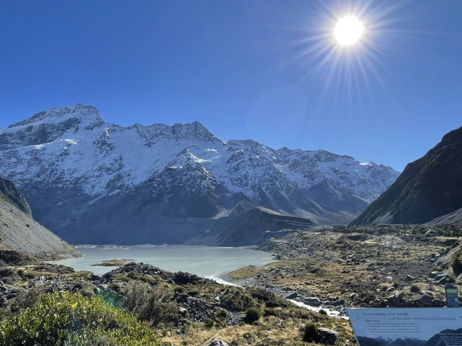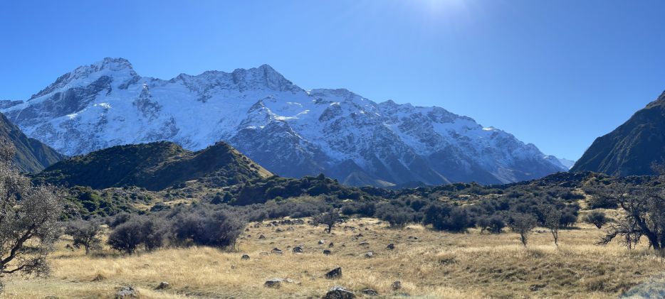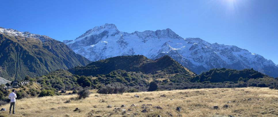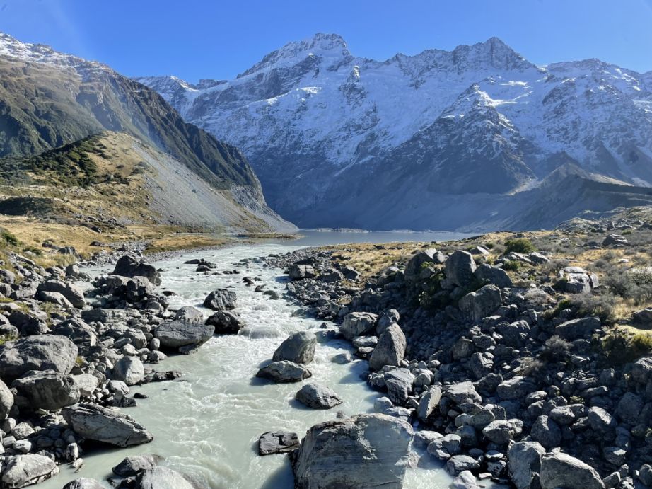 As we looked back up, a breathtaking view opens before us, with the snow-capped summit of Aoraki/Mount Cook rising majestically against the clear blue sky.