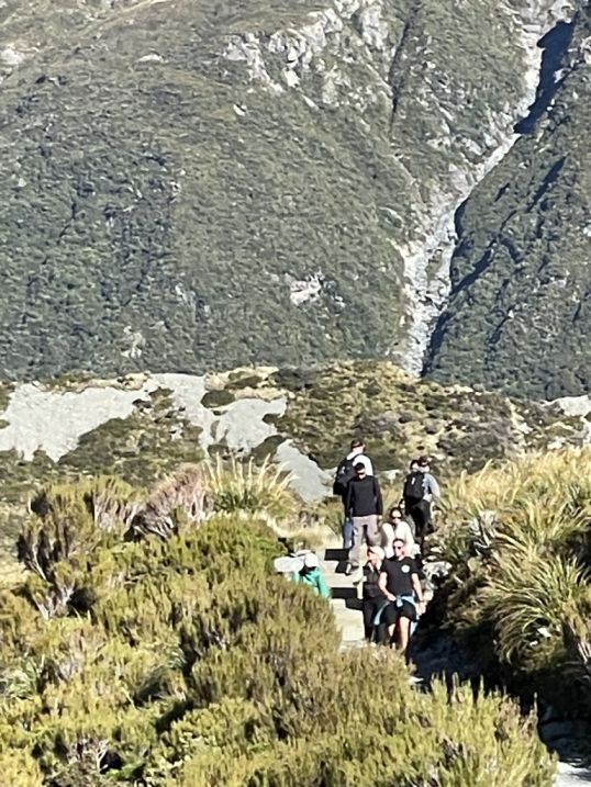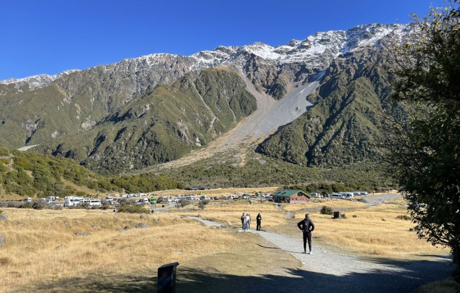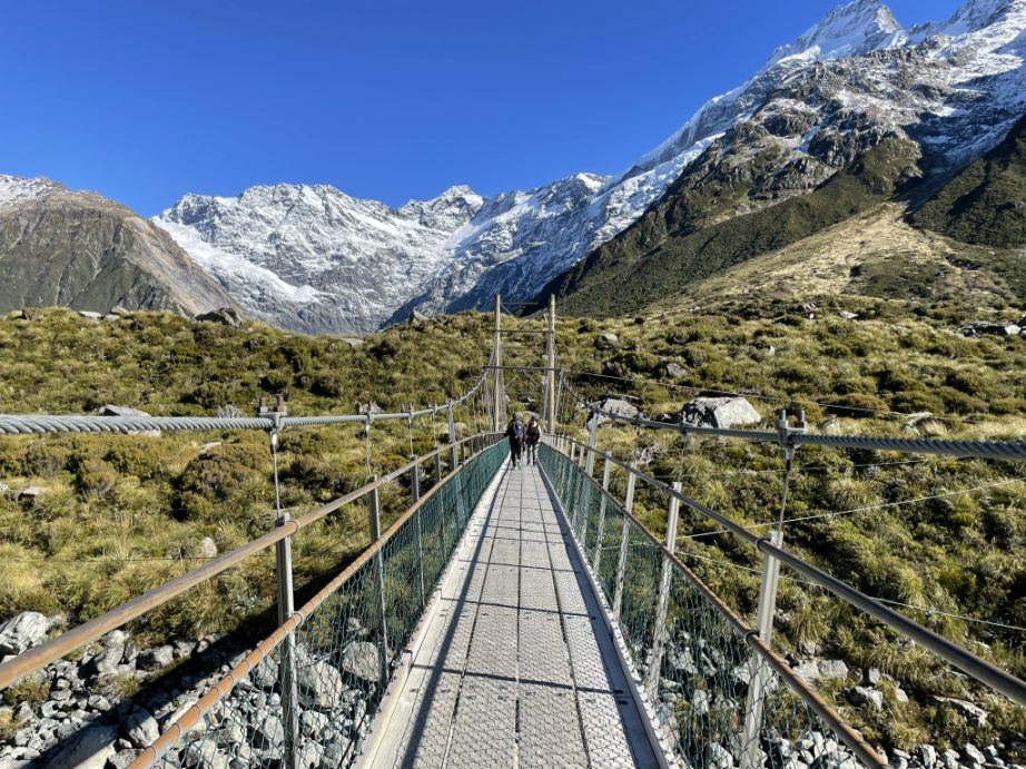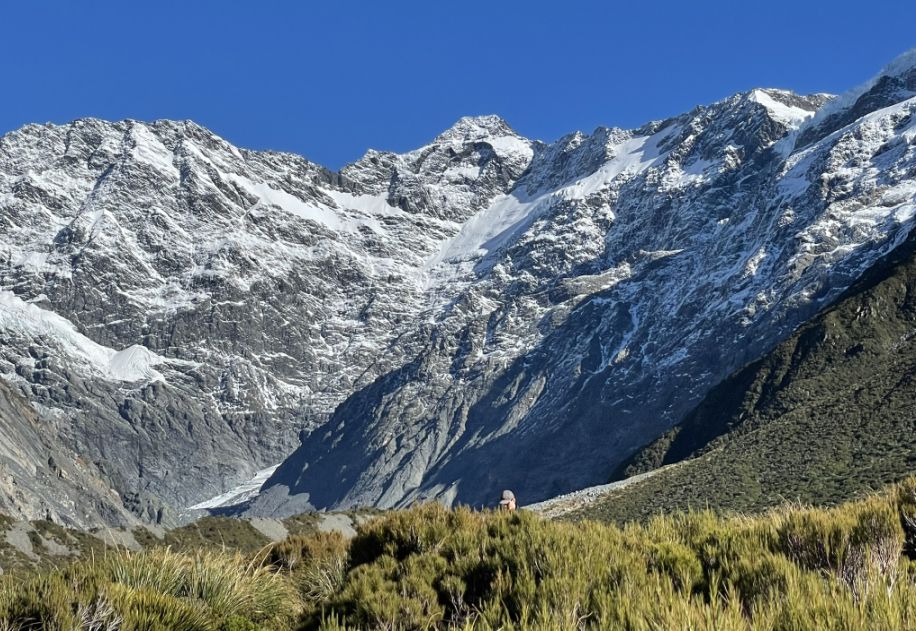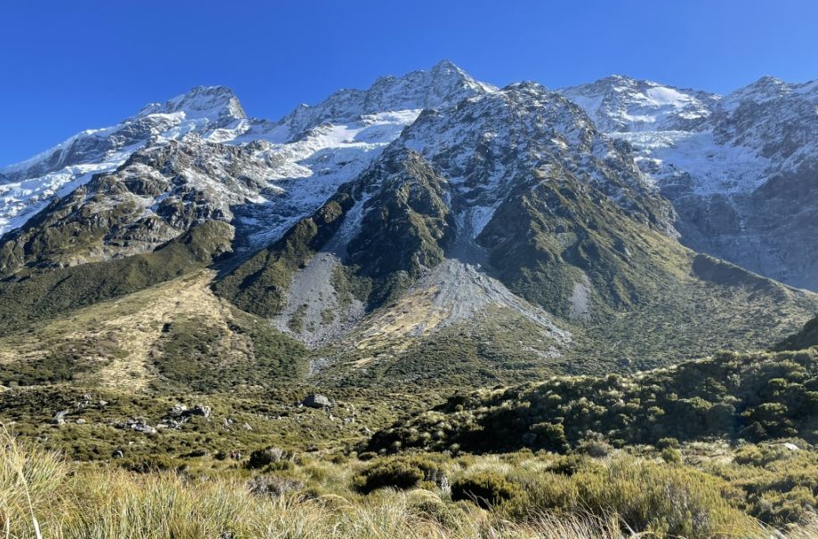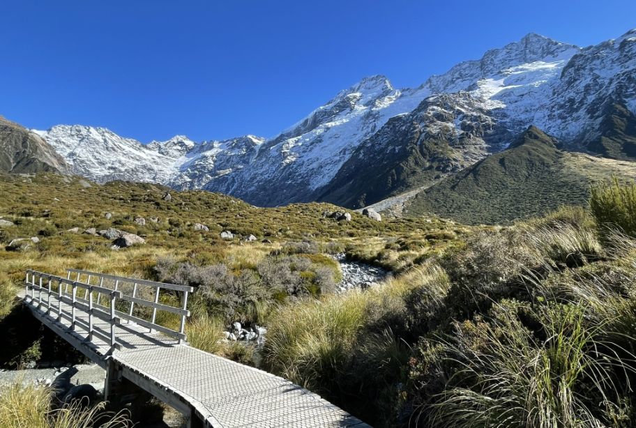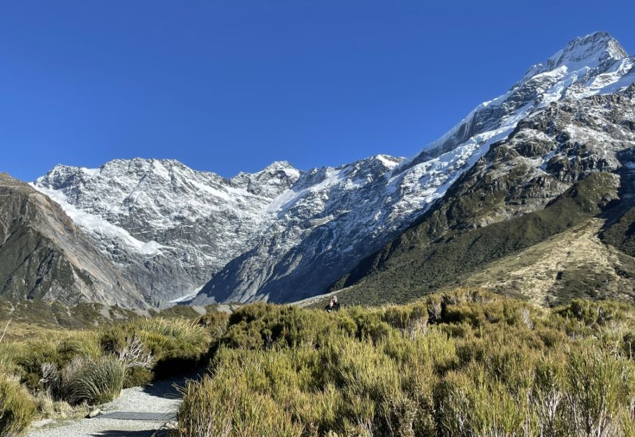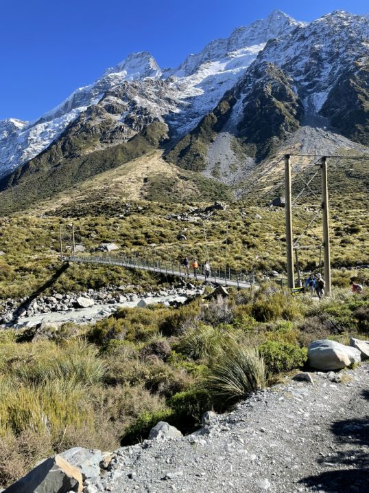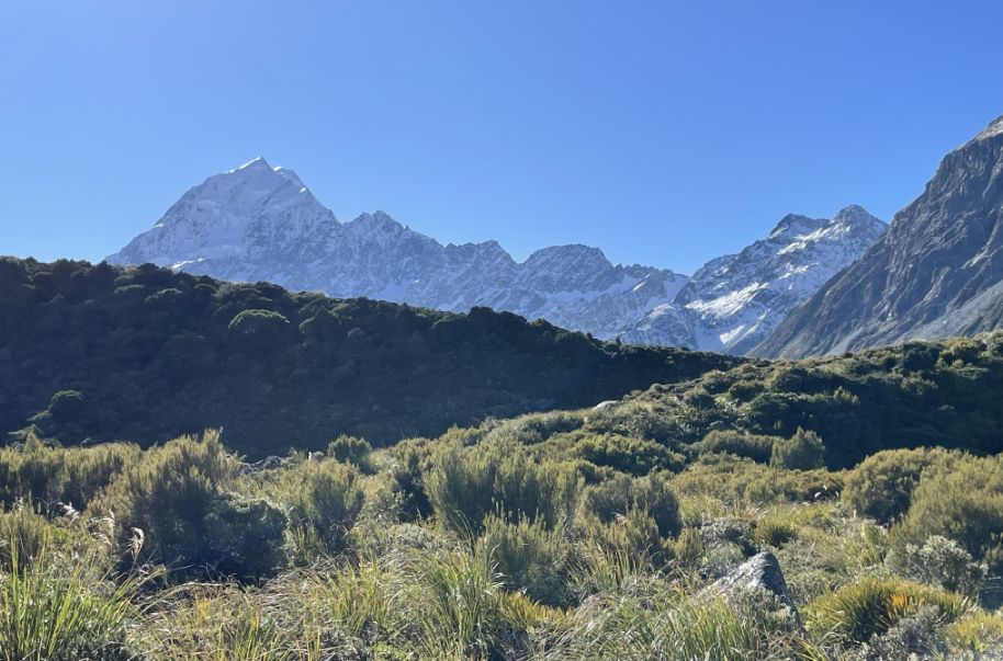 As we looked back up, a breathtaking view opens before us, with the snow-capped summit of Aoraki/Mount Cook rising majestically against the clear blue sky.