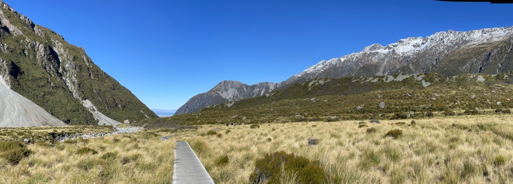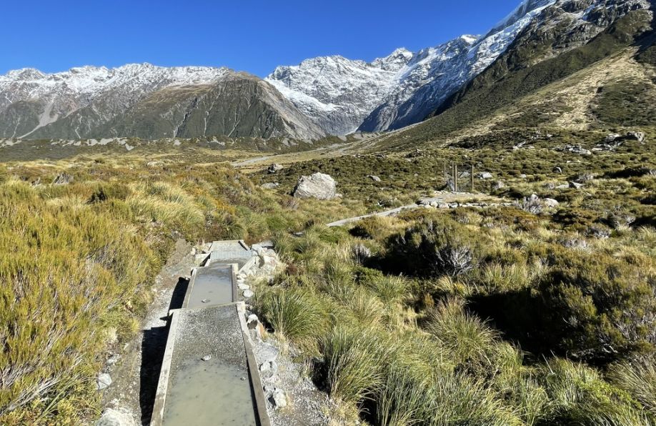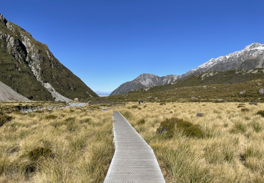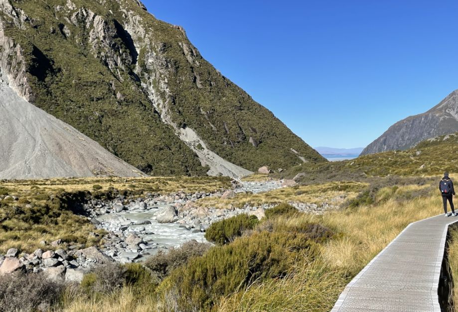 Beside the wooden boardwalk, the Hooker River flows steadily beside the trail, tracing a silvery path through the valley floor.