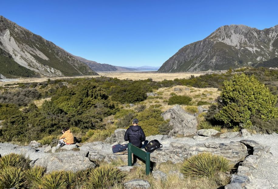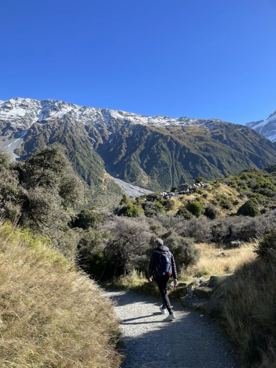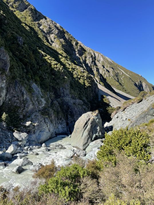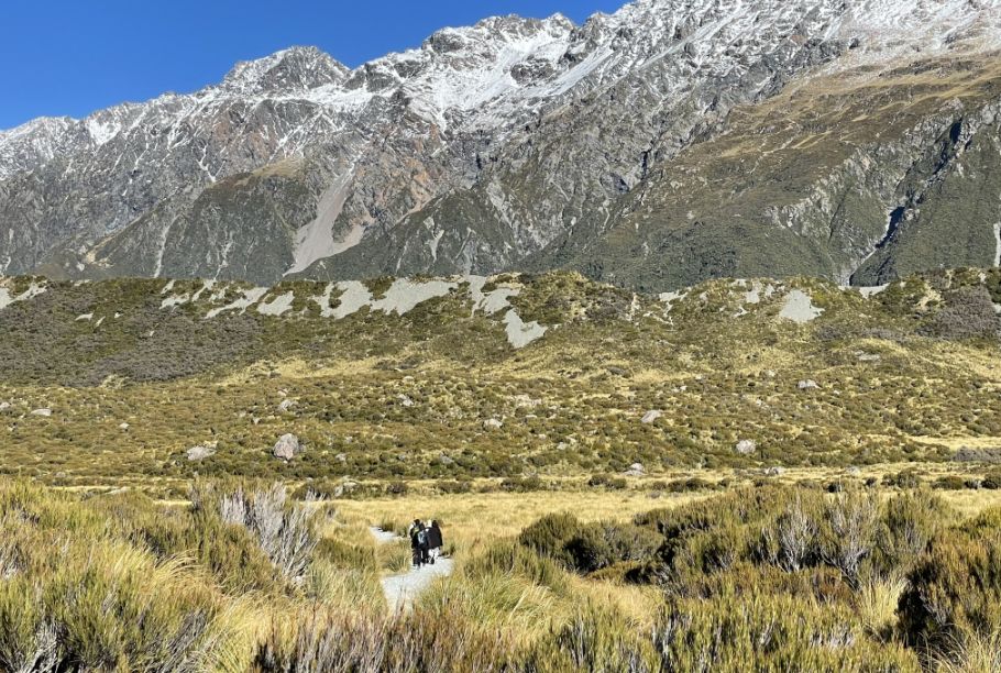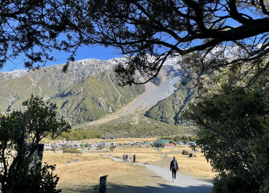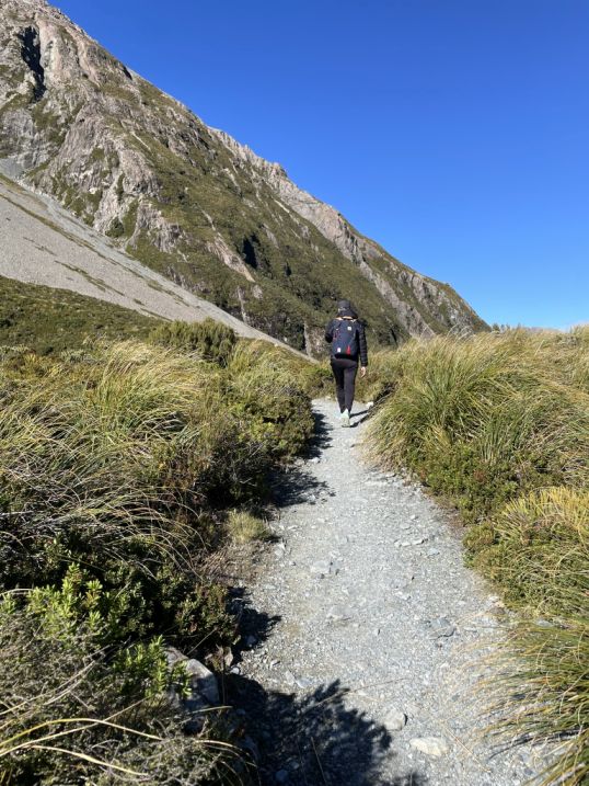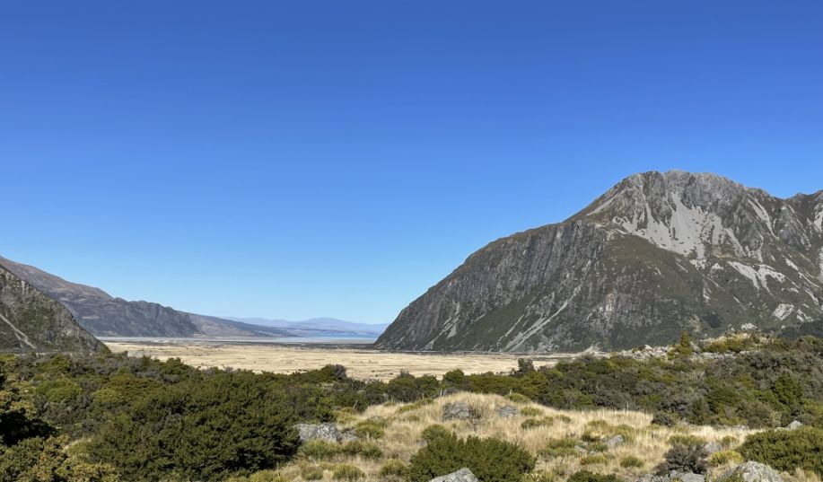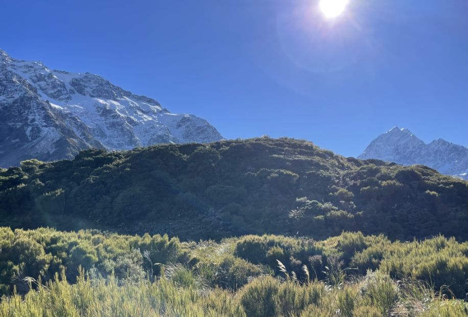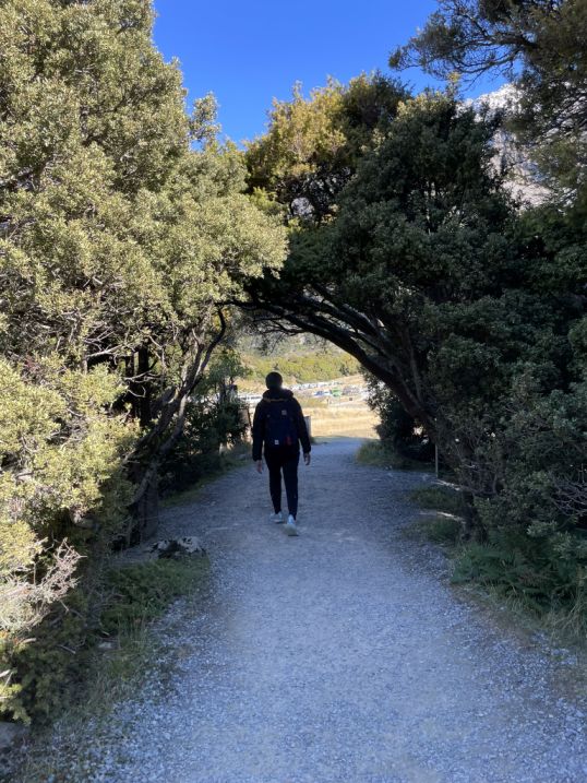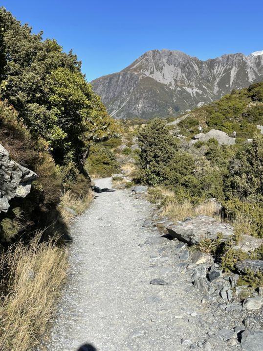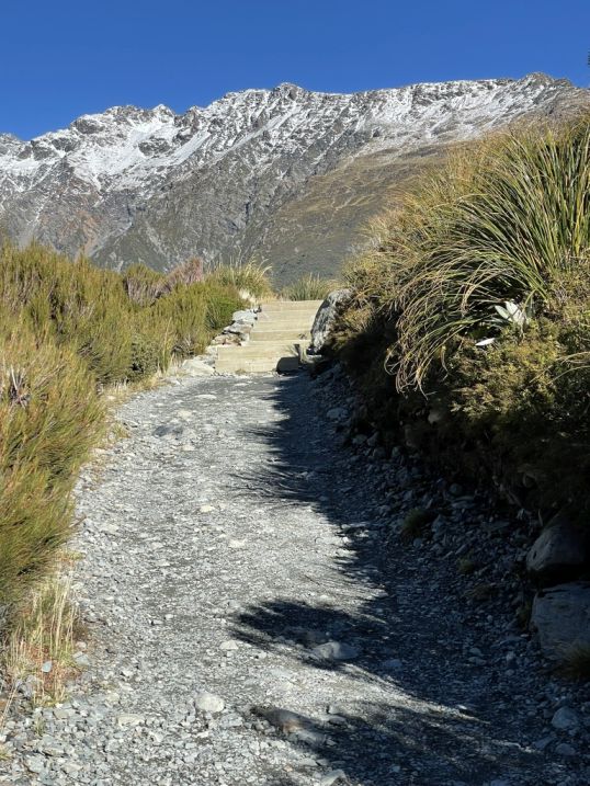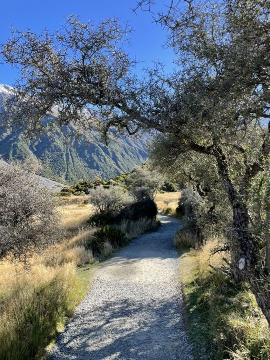 As we got near the end of the Hooker Valley Track, the open alpine landscape begins to shift. The golden grasses and wide valley slowly give way to a more sheltered trail, where clusters of native trees and shrubs line the path.