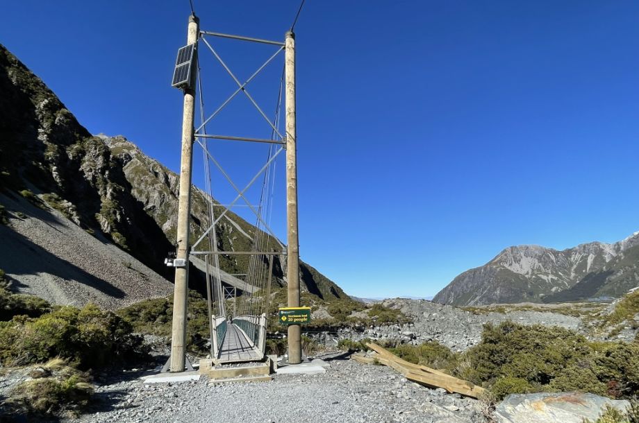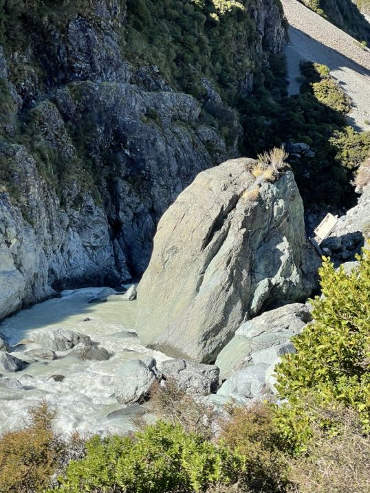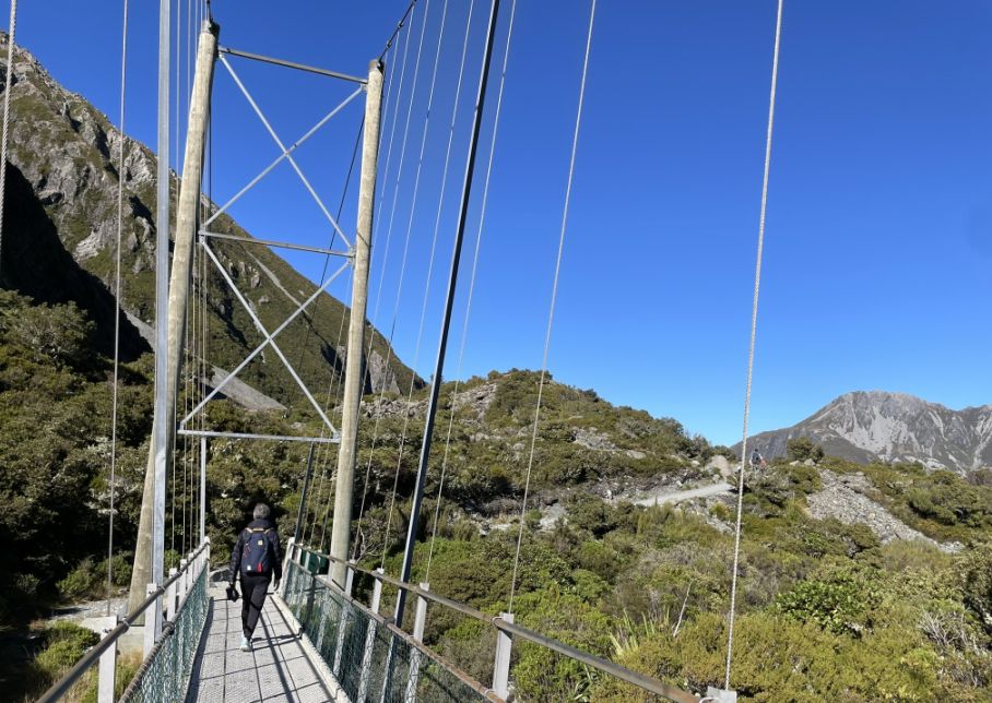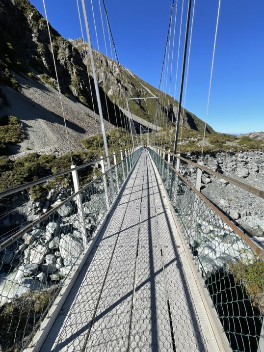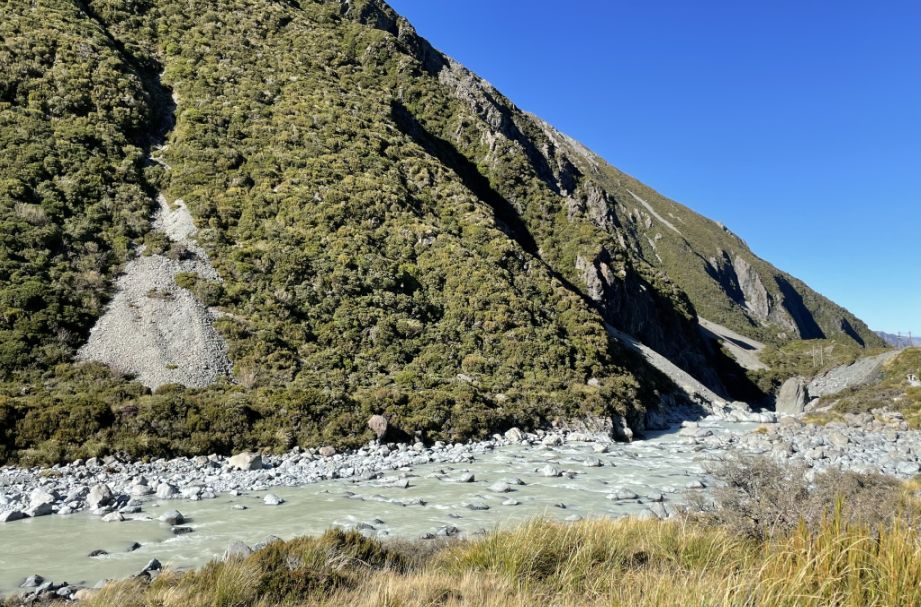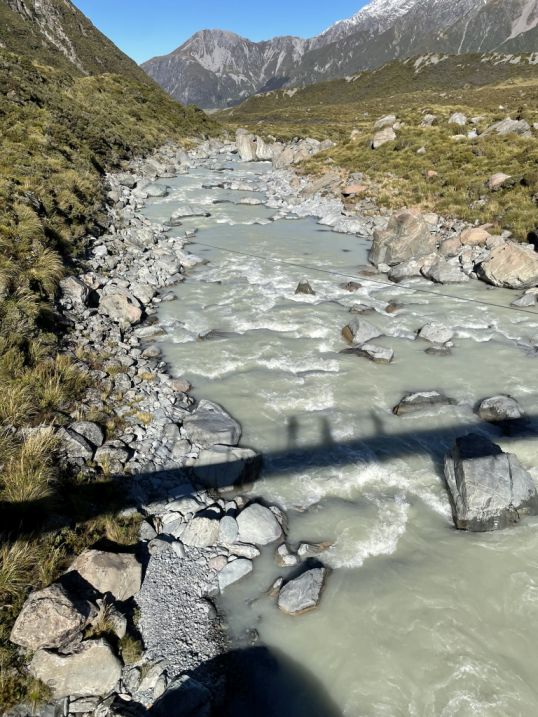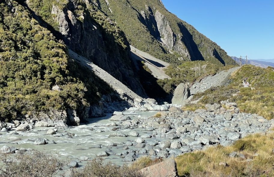As we looked in the distance is the Mueller Lake, a stunning proglacial lake sitting just upstream of the second bridge. Formed by meltwater from the Mueller Glacier and Mount Sefton’s icefields, this lake is often filled with ice-cold, sediment-rich water, giving it a milky turquoise or gray color depending on the light.