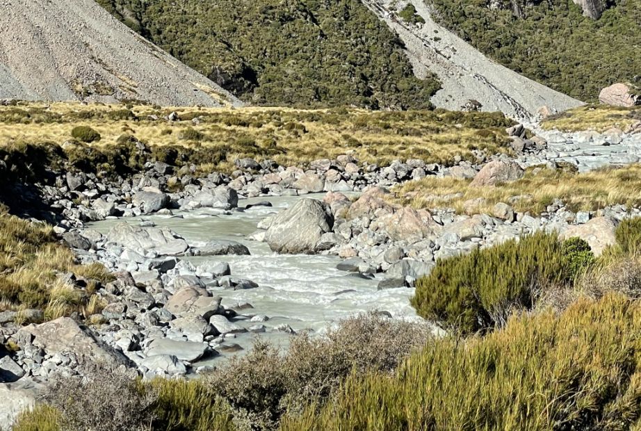 It's a glacial river, born from the meltwater of Hooker Lake and the Hooker Glacier, which gives it that distinctive milky gray hue, caused by finely ground rock flour suspended in the water.