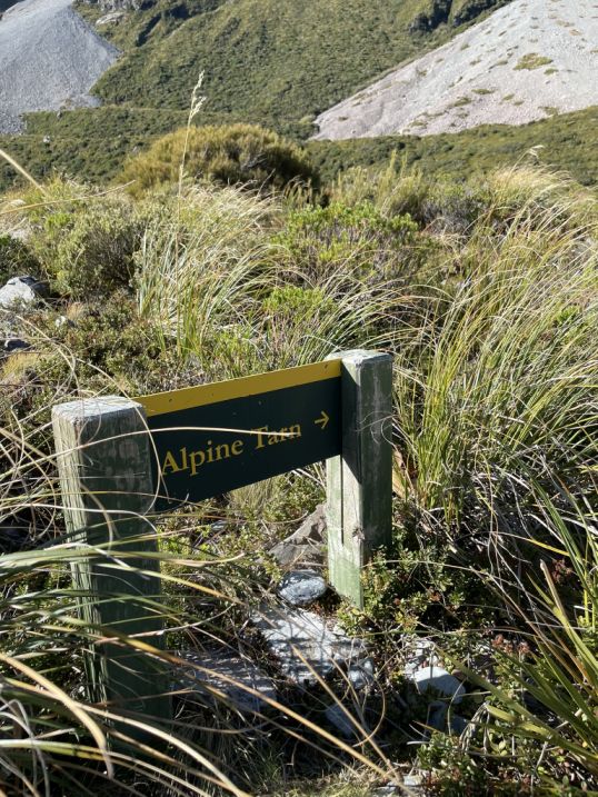 The trail goes through low alpine shrubs and hardy tussock grasses which dominate the terrain. The gravel path winds gently around the tarn.