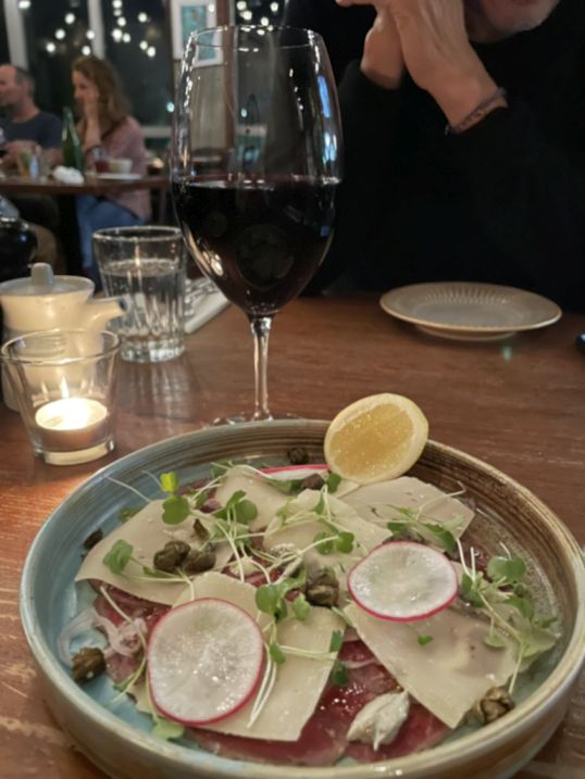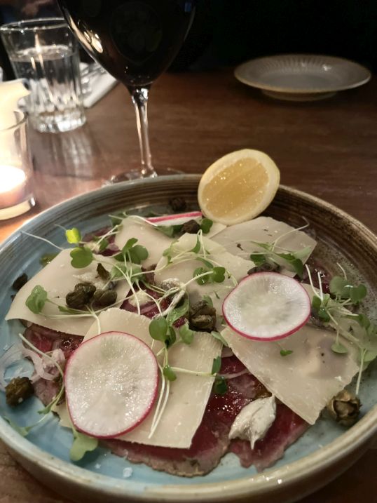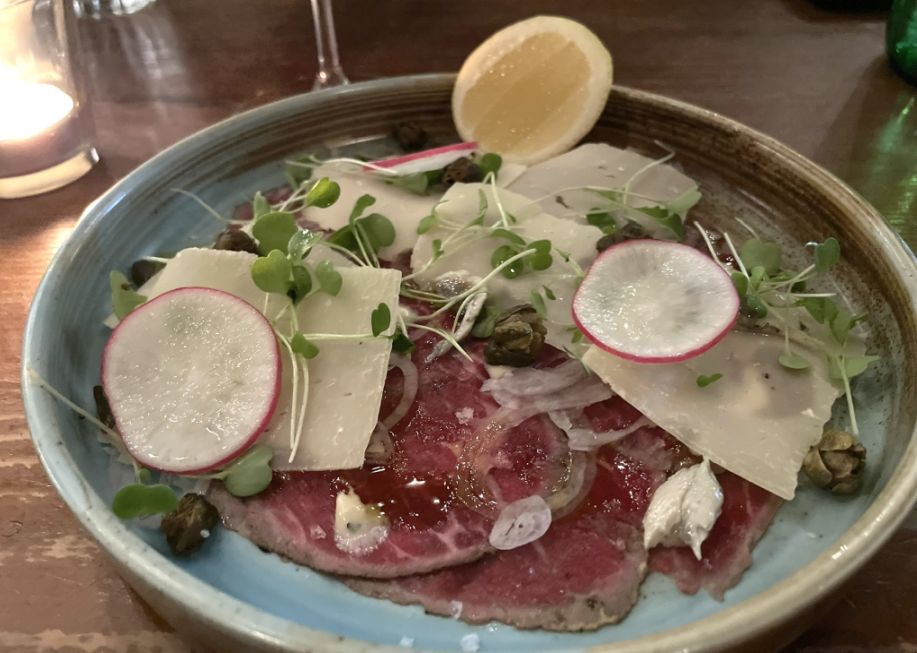 Beef Carpaccio with white anchovy, capers, shallots, horseradish aioli.