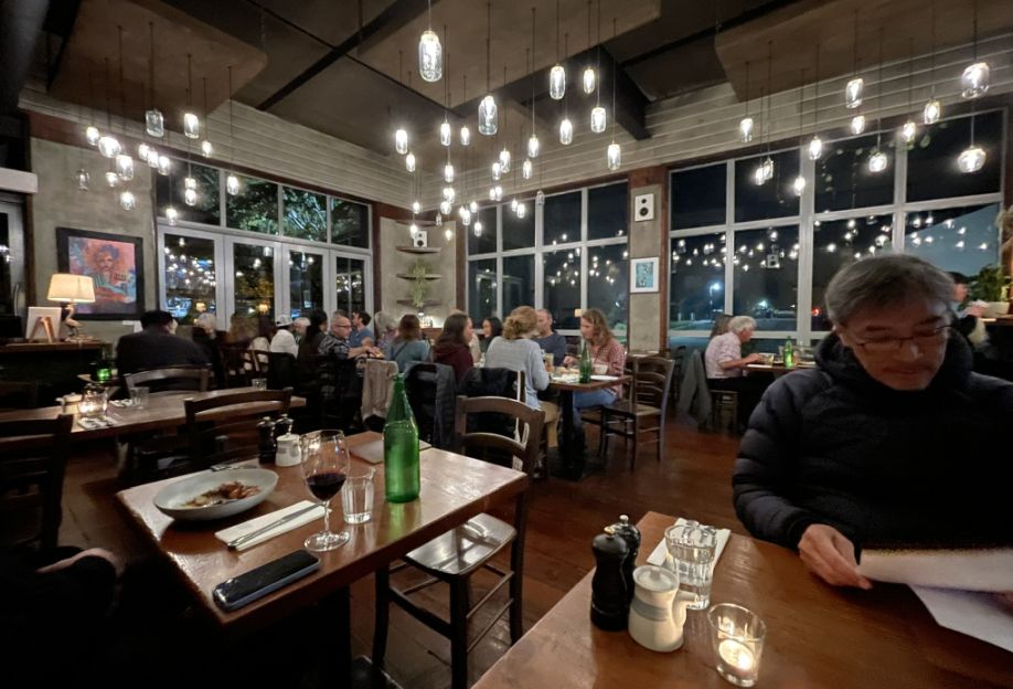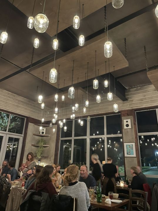 At night, Francesca’s Italian Kitchen looks especially inviting with he large glass windows glow with a golden warmth, and the outdoor greenhouse seating sparkles under soft string lights, creating a cozy, romantic atmosphere.