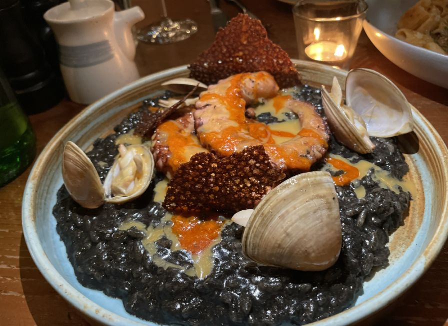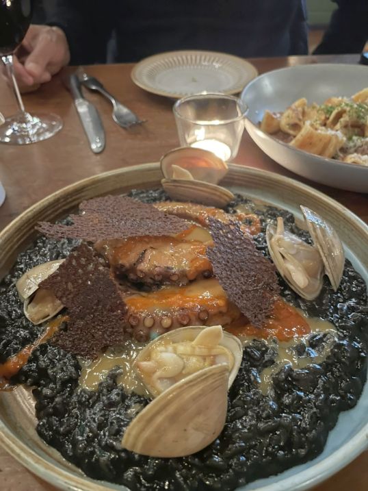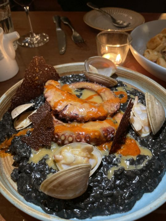 Risotto nero, octopus, clams, nduja, squid ink, bisque, tuile
