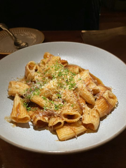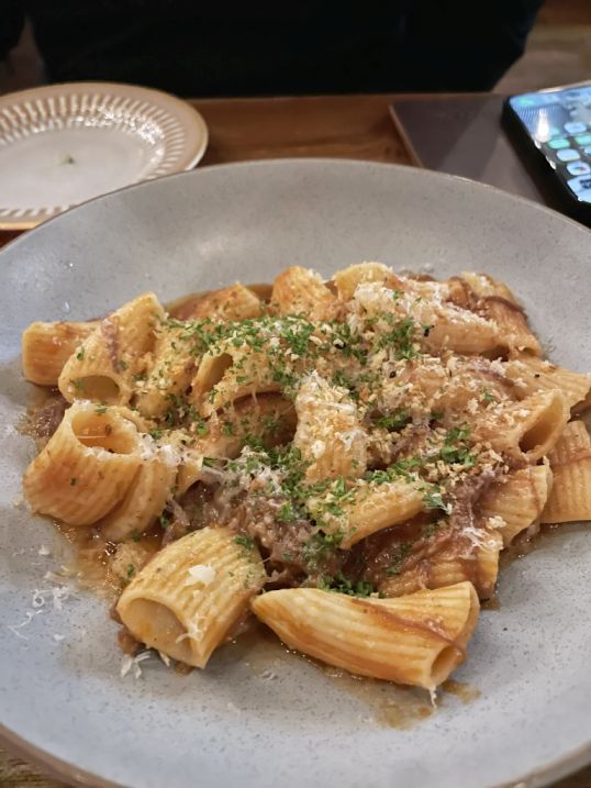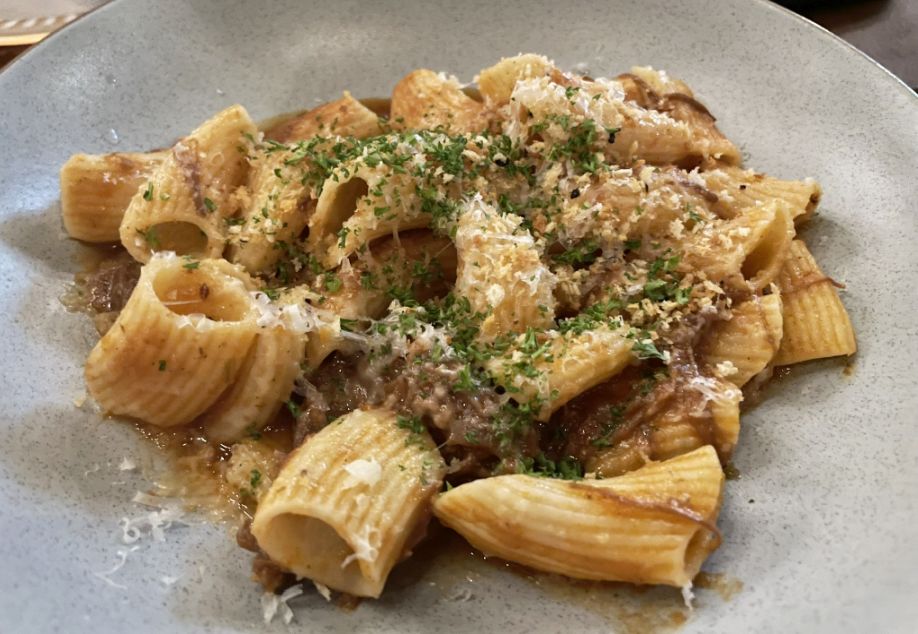 Pasta rigatoni, slow cooked short rib ragu, pangrattato, parmesan
