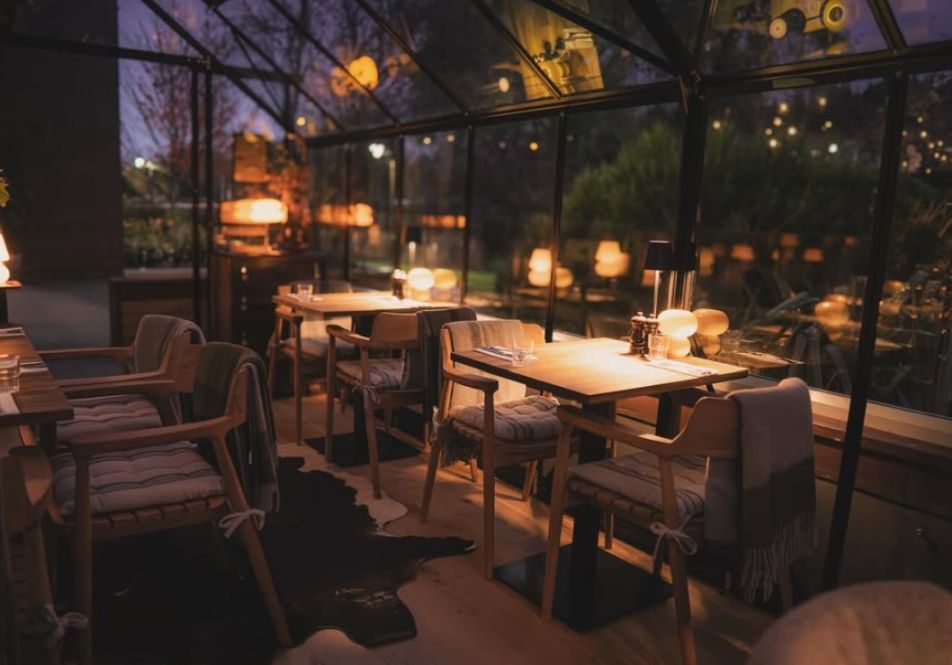 Outside, there’s often seating tucked under awnings or in a greenhouse-style extension, clear panels and twinkling lights give it a cozy, almost European café feel, while still letting you enjoy the fresh mountain air.