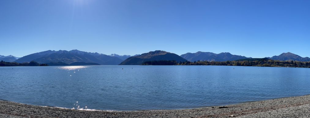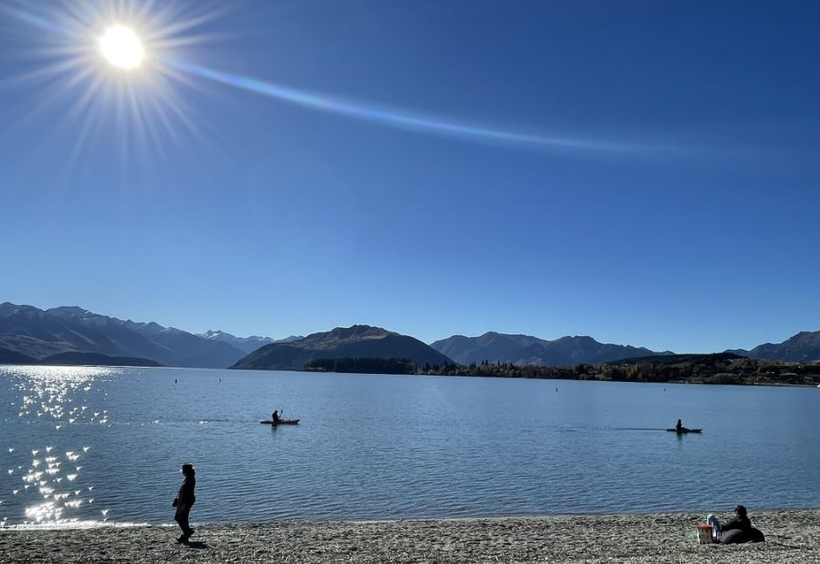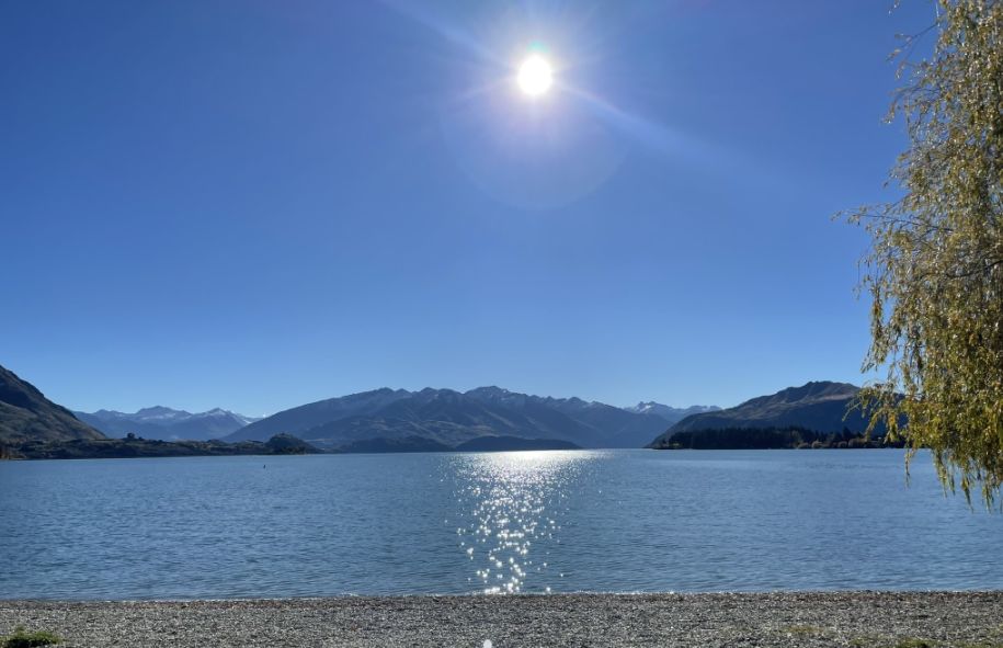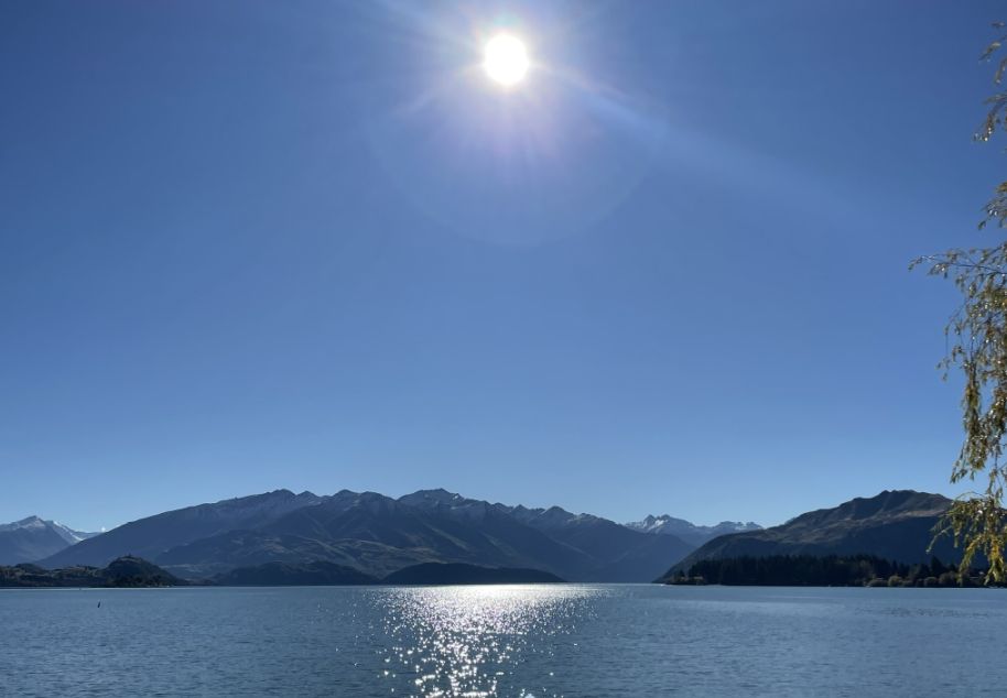 The sun hangs bright above, scattering shimmering reflections across the surface of Lake Wānaka.