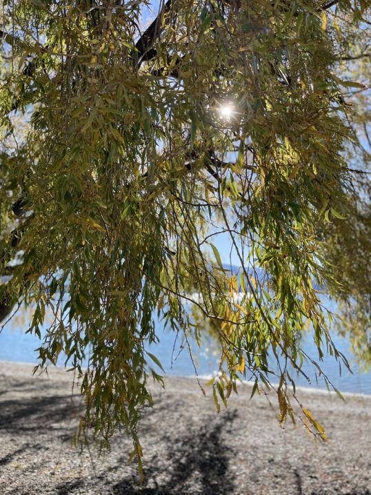 Along the shore, the willow branches dip low, their slender tips almost grazing the water’s surface. They sway gently in the breeze, creating soft, rippling shadows on the pebbles and reflecting in the lake like delicate brushstrokes.