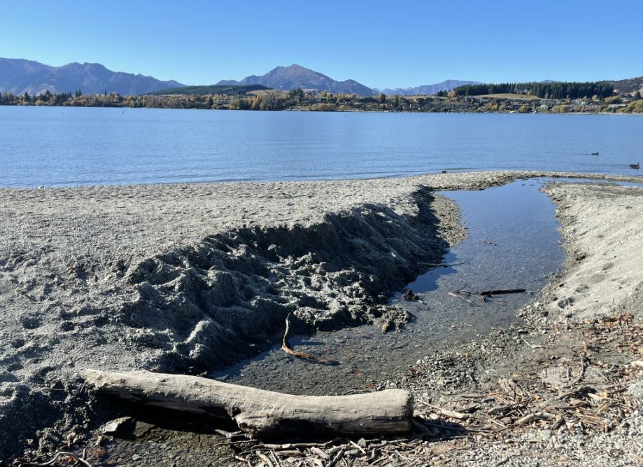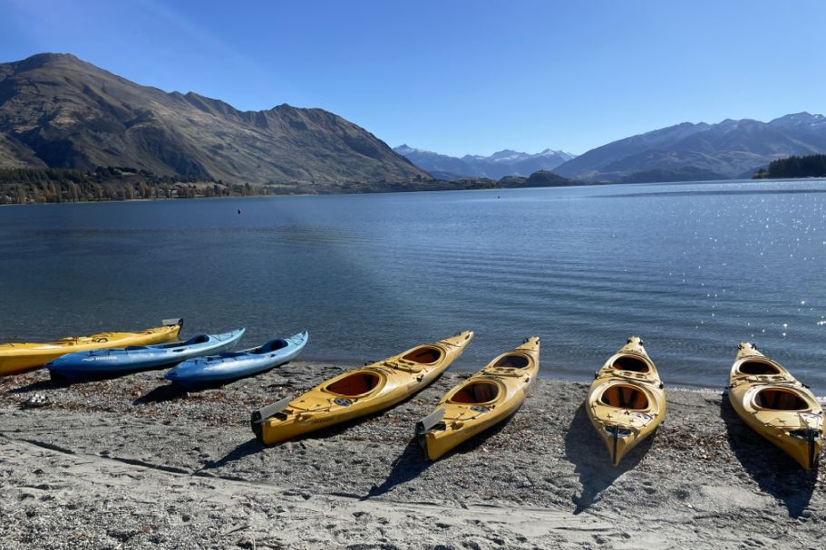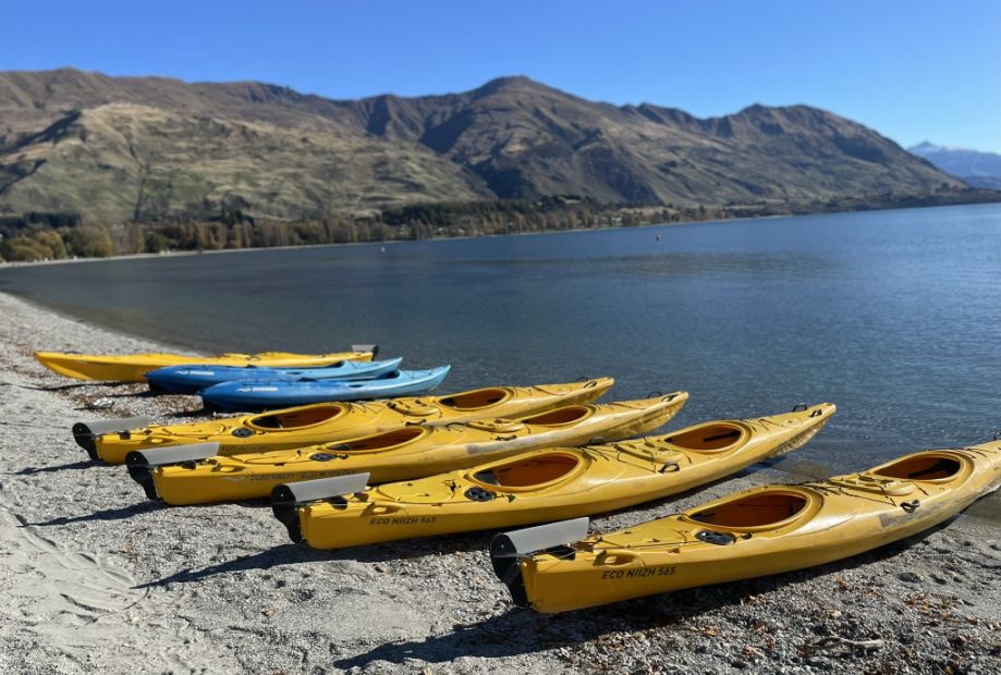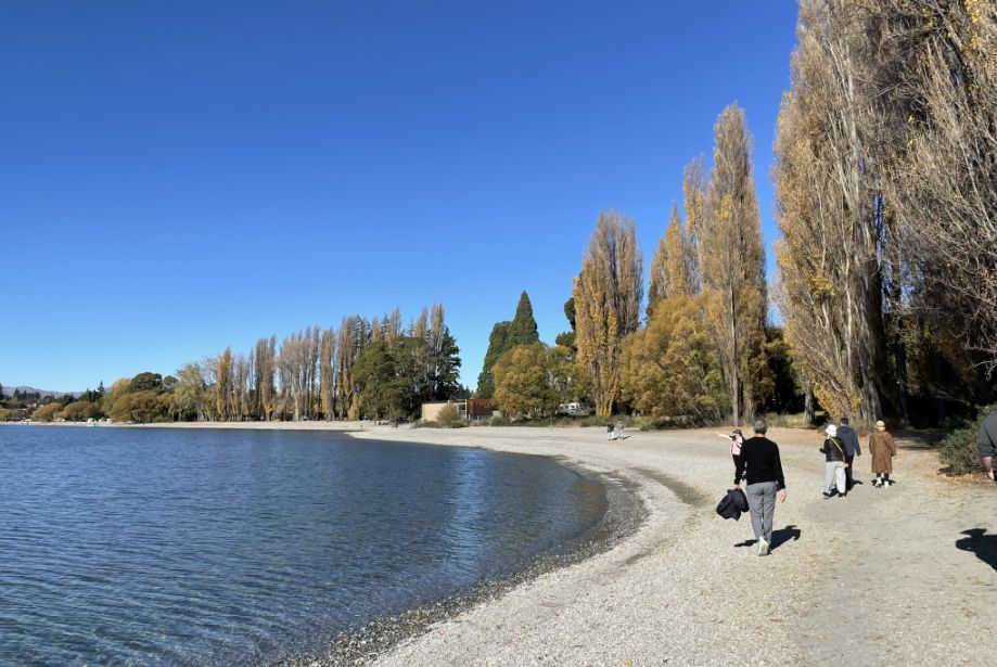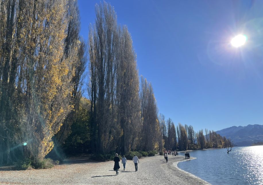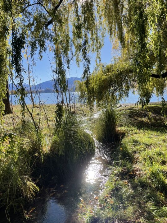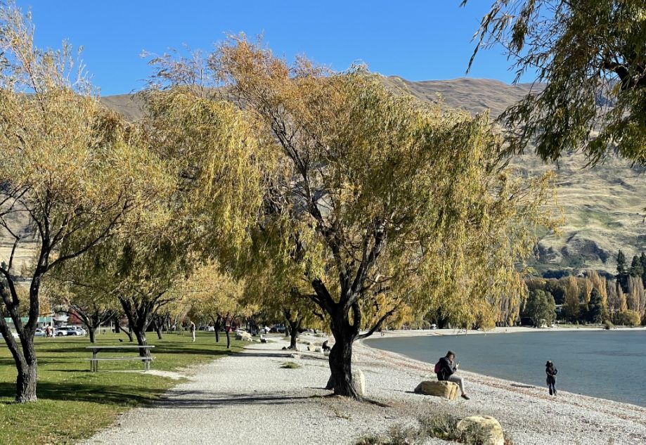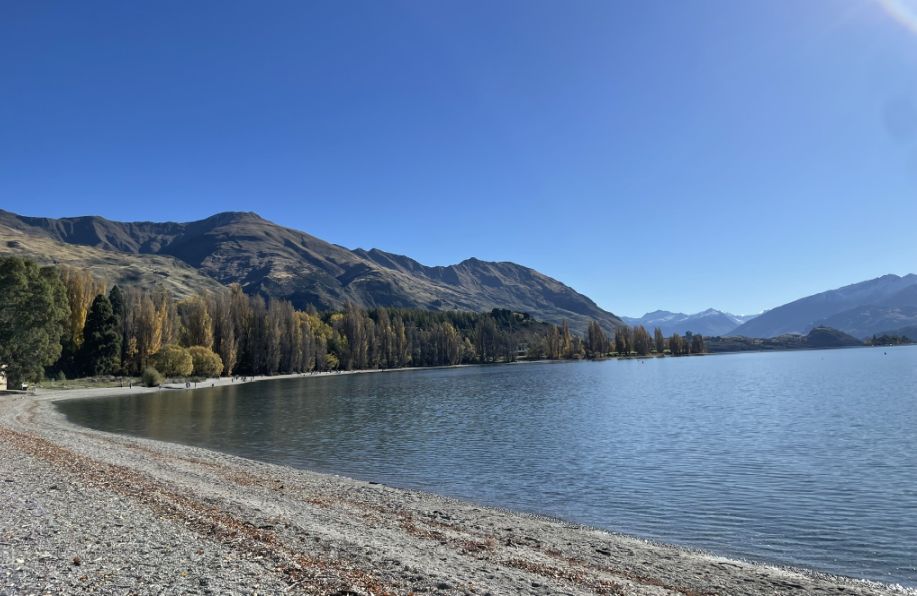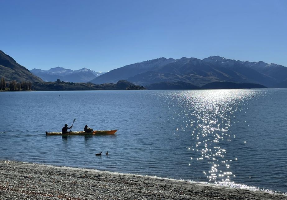 The canoers move slowly, taking in the breathtaking surroundings with the golden willows along the shore, the distant mountains rising against the sky, and the sunlight glinting off the water. It’s a peaceful, almost meditative scene, where the rhythm of paddles dipping in and out of the water matches the calm pulse of Lake Wānaka itself.