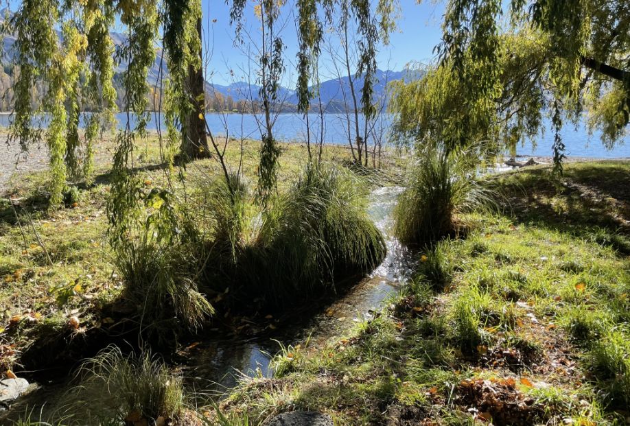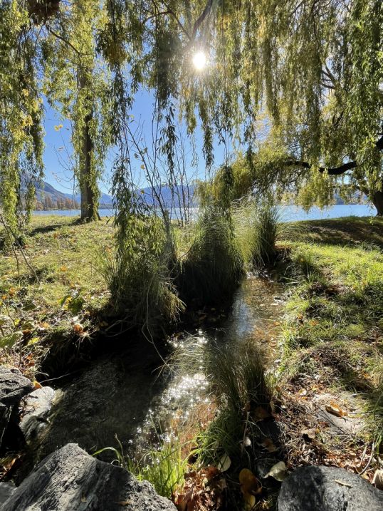 The willow’s branches dip toward the stream, almost as if reaching to touch it, creating a gentle, sheltered nook. The sound of the flowing water blends with the rustle of leaves in the breeze, giving the spot a peaceful, almost secret-garden feel.