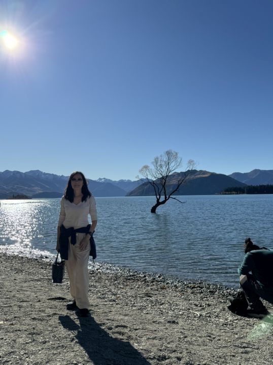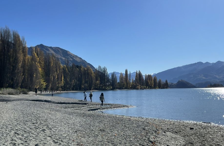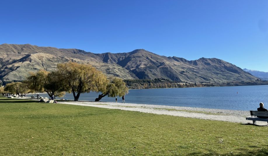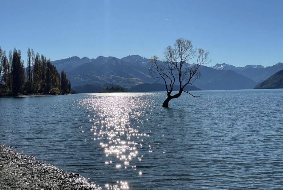 We stayed on the shore, watching the lone Wānaka Tree, its roots submerged in the clear lake water, as gentle ripples shimmered in the afternoon light. The scene was breathtaking, with the shimmering lake stretching toward the snow-tipped mountains that rose gracefully in the background.