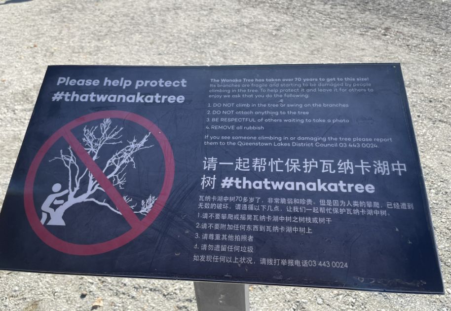 In late 2017, one of the lower branches of the Wānaka Tree snapped off due to tourists climbing on it. The tree’s bark is particularly delicate, and its branches are fragile. As a result, the Queenstown Lakes District Council installed signage in English and Mandarin urging visitors not to climb the tree to prevent further harm.