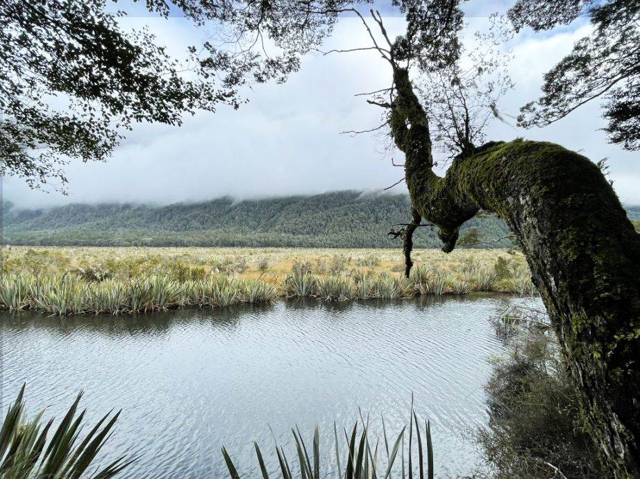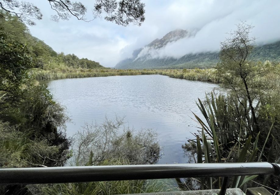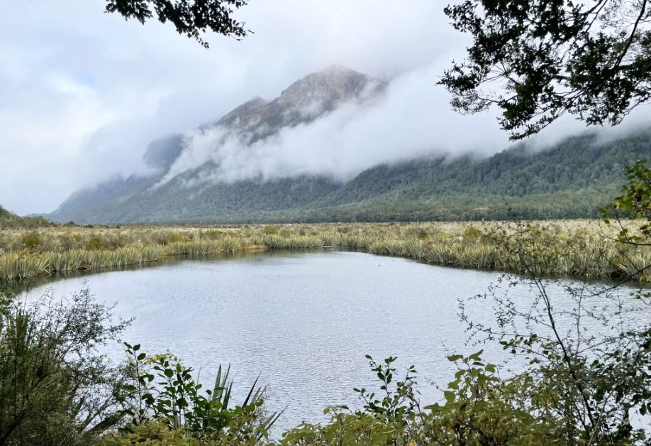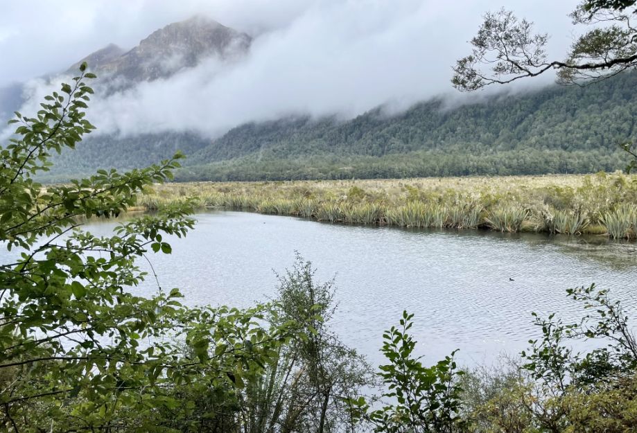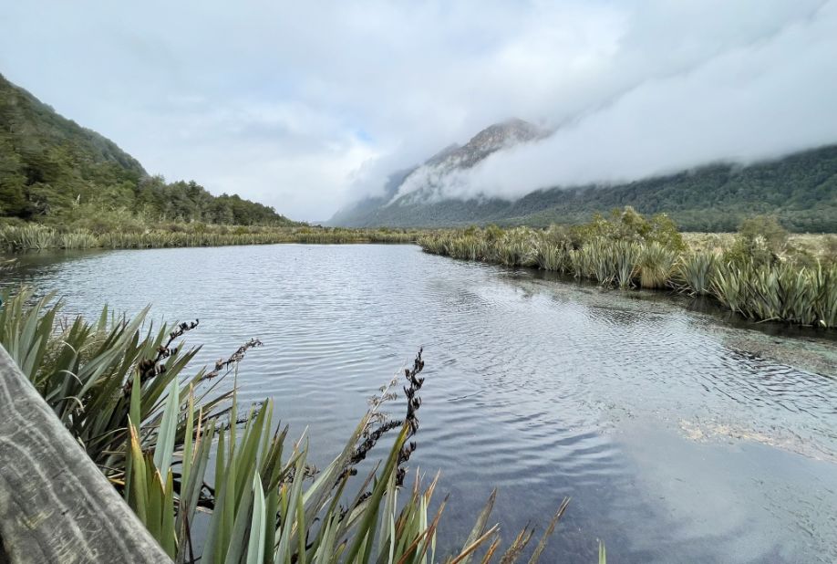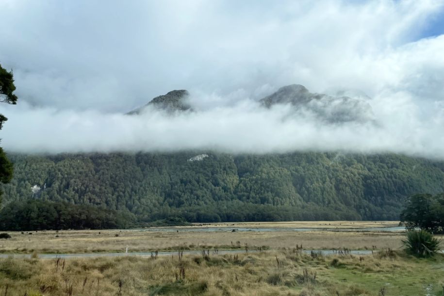From the boardwalk, the river flowing gently, its banks lined with patches of yellow and green grass swaying in the breeze. Ahead, the mountains rose dramatically, their summits breaking through a veil of drifting clouds, the peaks still clearly visible against the sky. The scene felt both peaceful and grand, a perfect glimpse of Fiordland’s wild beauty.