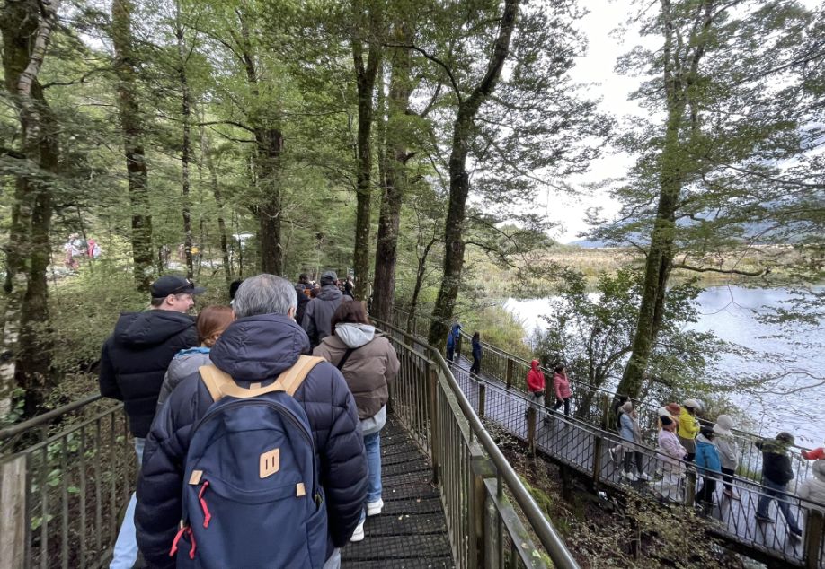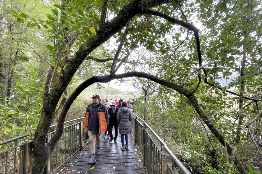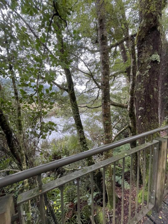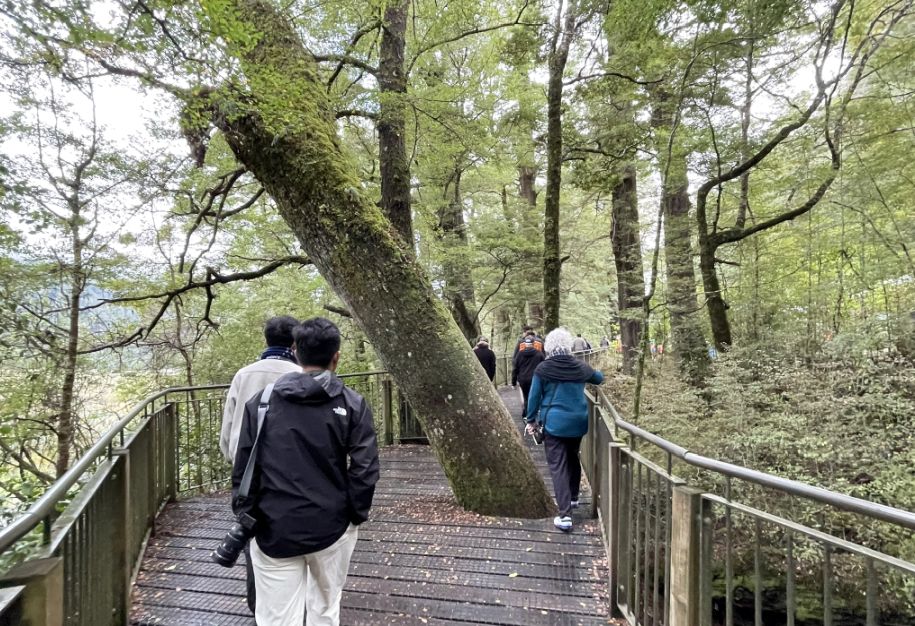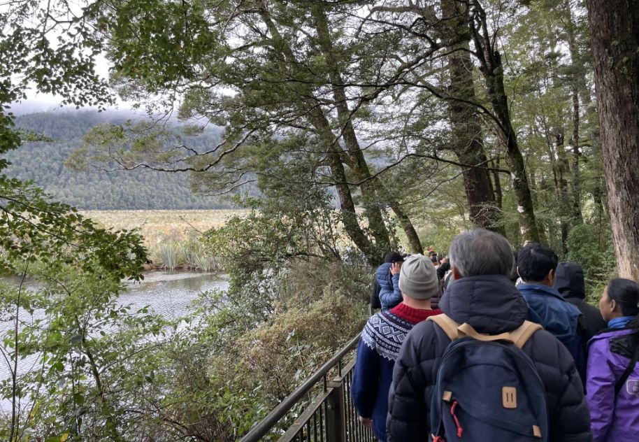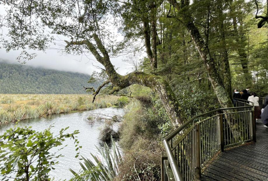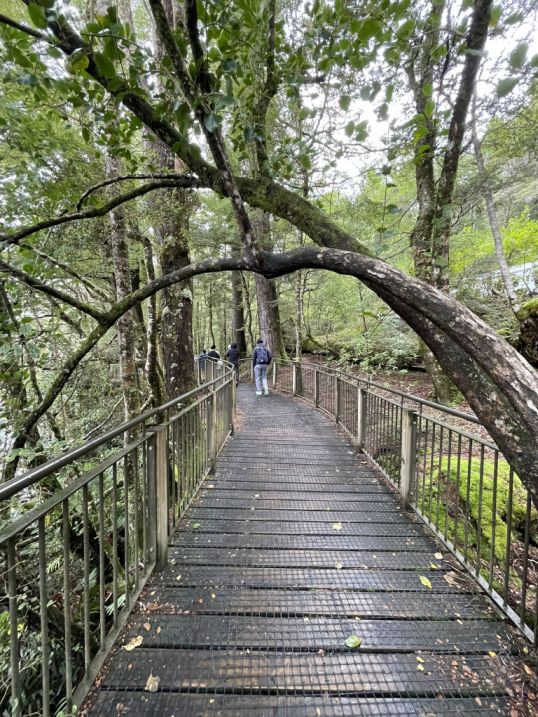 We are now going back to our bus. On the boardwalk, there’s a tree growing right in the middle, its trunk rising straight through a neat opening cut into the wooden planks. Rather than remove it, the path was built around the tree, allowing it to keep growing naturally while becoming part of the walkway itself. It feels like a reminder of how the forest and the trail coexist, blending human design with the untamed beauty of Fiordland.