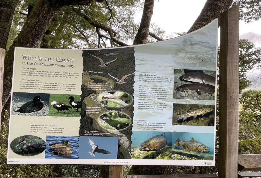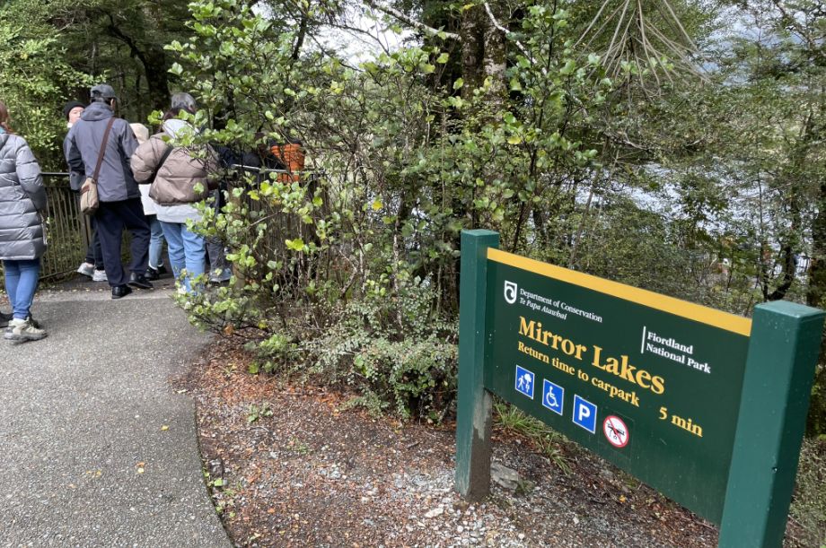 Our bus make a stop at Mirror Lakes which is one of the most famous stops along the Te Anau–Milford Highway, a series of small, tranquil lakes that perfectly reflect the surrounding mountains on calm days.