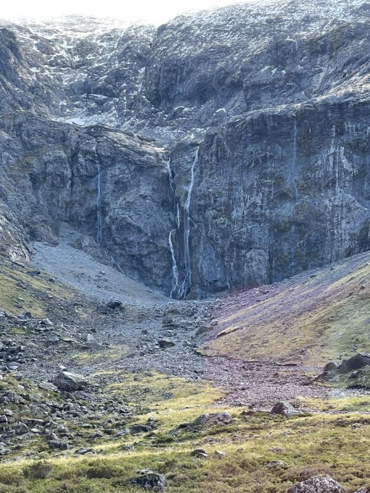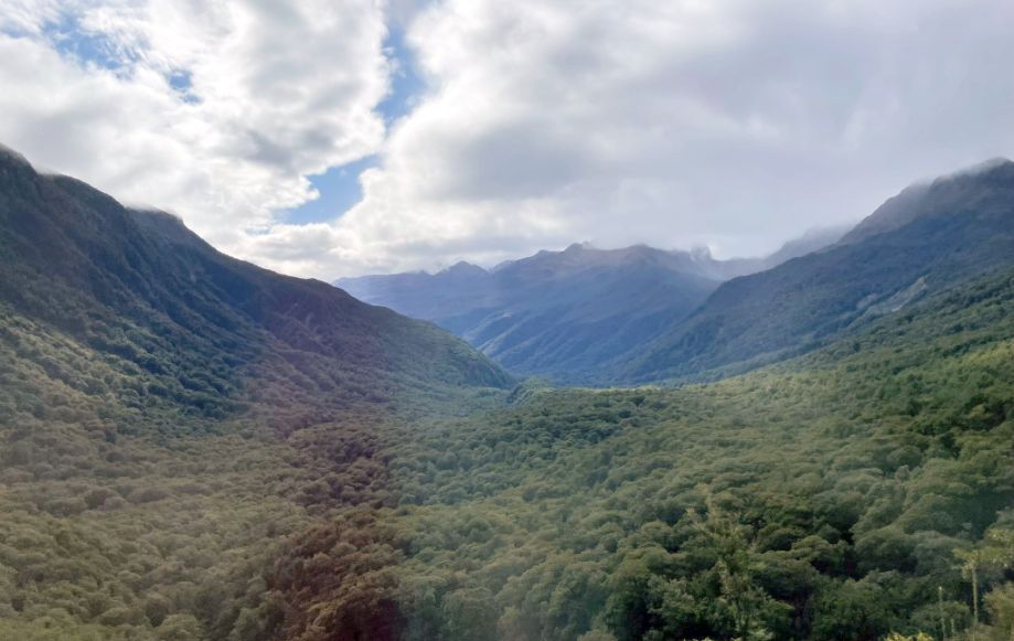 As we approached the Eglinton Valley Camp, the view from the bus opened up to towering mountains rising steeply on either side, their slopes blanketed in dense green forest. Between the trees, small shimmering patches of water appeared.