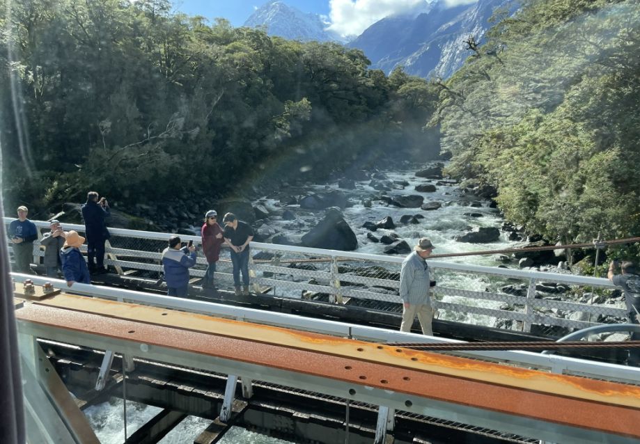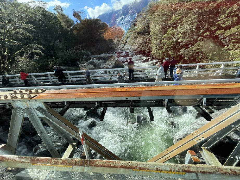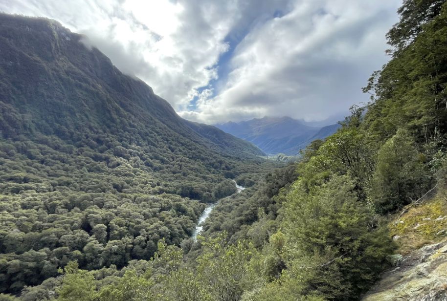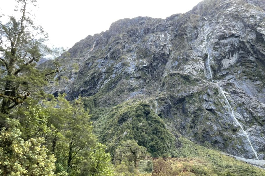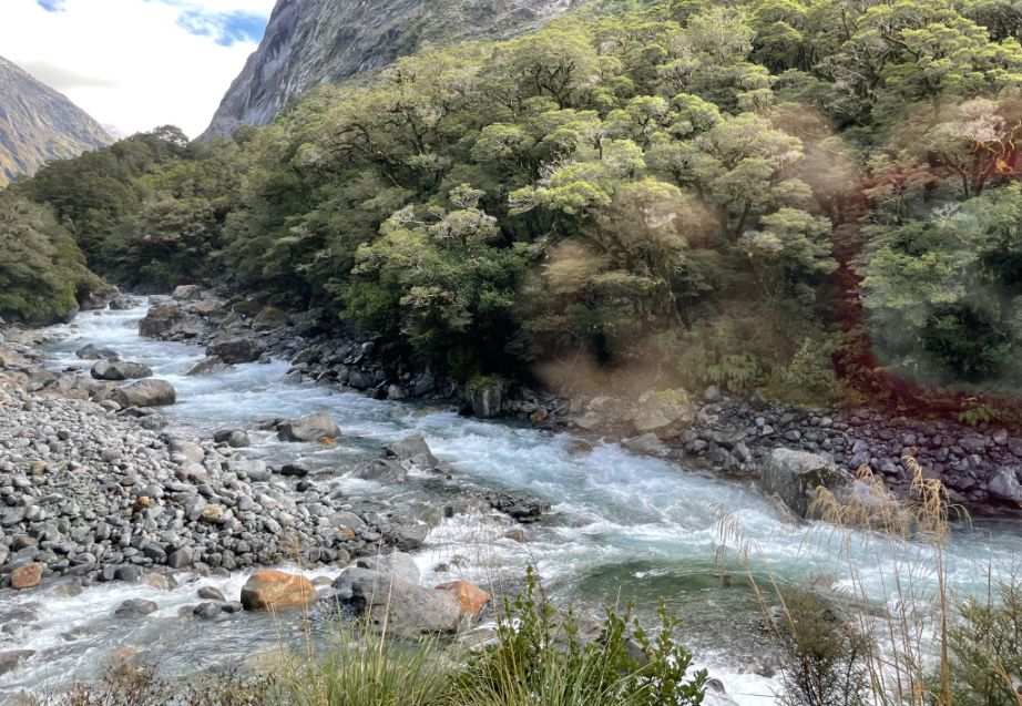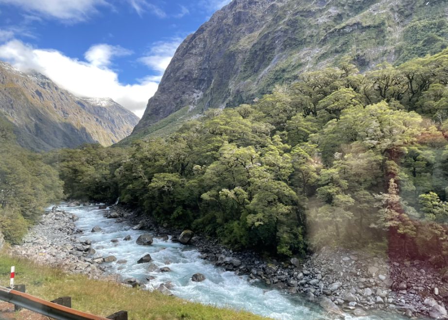 As our bus drove further along the Milford Highway, we came across the Hollyford River, winding its way through the valley with crystal-clear waters.