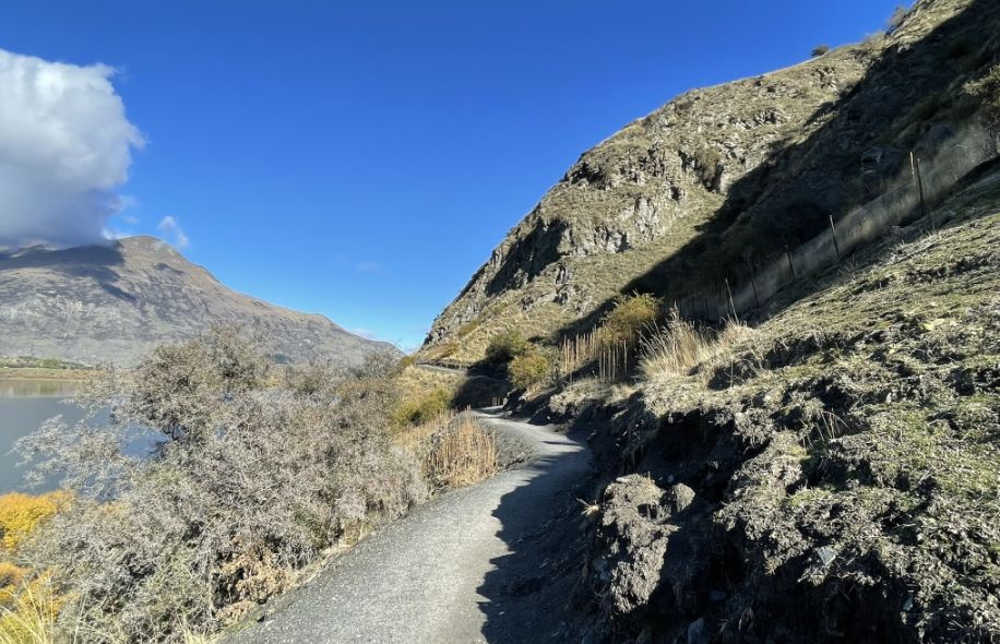 Leaving the open lawns of the reserve behind, the trail begins to climb gently, leading you up a hilly path on the far side of Lake Hayes.